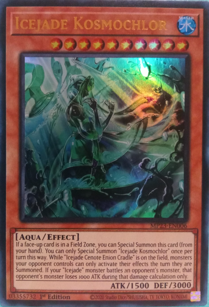 The Icejade Kosmochlor MP23-EN006 25th Anniversary Tin: Dueling Heroes Mega Pack 1st card is a highly sought-after collectible card in the Yu-Gi-Oh! TCG universe. As an ultra rare Aqua creature with a high defense of 3000 and attack power of 1500, this 1st edition card from Konami is a valuable addition to any player's deck. Its unique color attribute, effective abilities, and limited availability make it a desirable choice for collectors and players alike. The English language card is a must-have for fans of the game looking to expand their collection with a special and powerful addition.