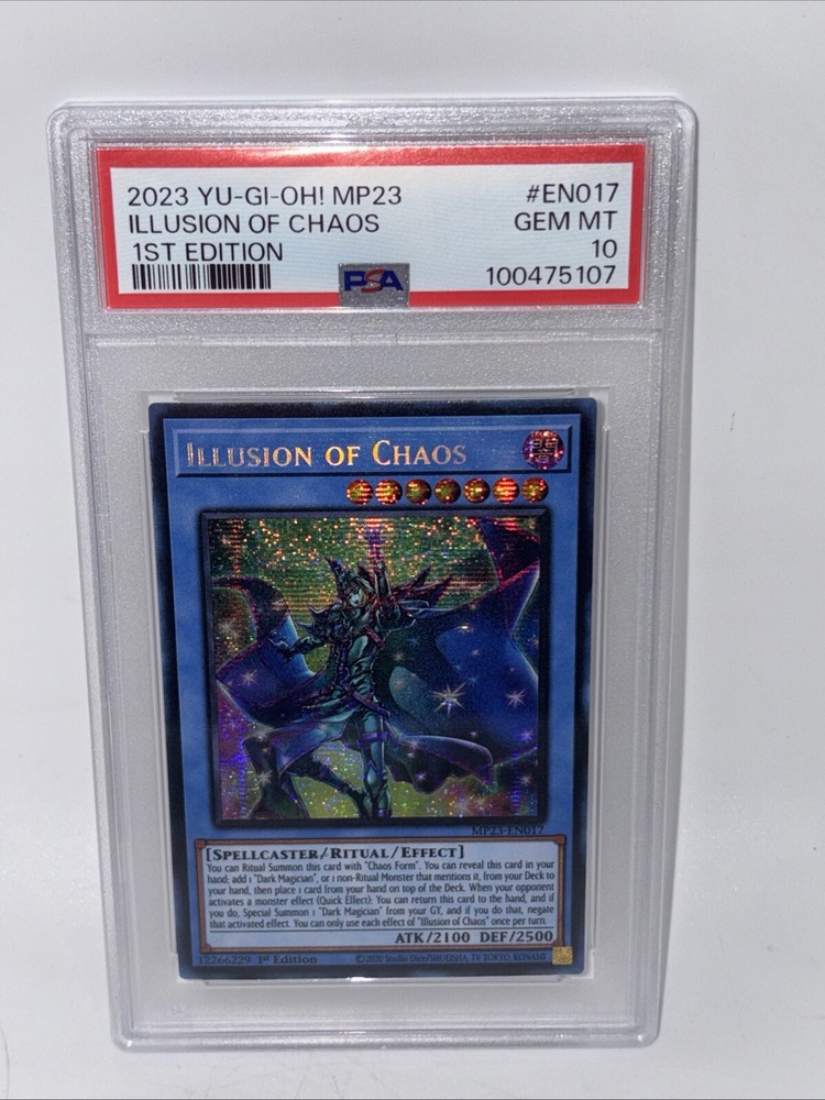 This Illusion of Chaos card is a must-have for any Yu-Gi-Oh! TCG collector. With a Dark color attribute and a Prismatic Secret Rare rarity, this 1st Edition card is sure to be a standout addition to your collection. The card features an Illusion creature/monster type and a Ritual card type, with an MP23-EN017 card number. The card's defense/toughness is 2500, and its attack/power is 2100, making it a formidable addition to your deck. The card is in English language and manufactured by Konami. This item is perfect for fans of the Yu-Gi-Oh! TCG game and collectors alike.