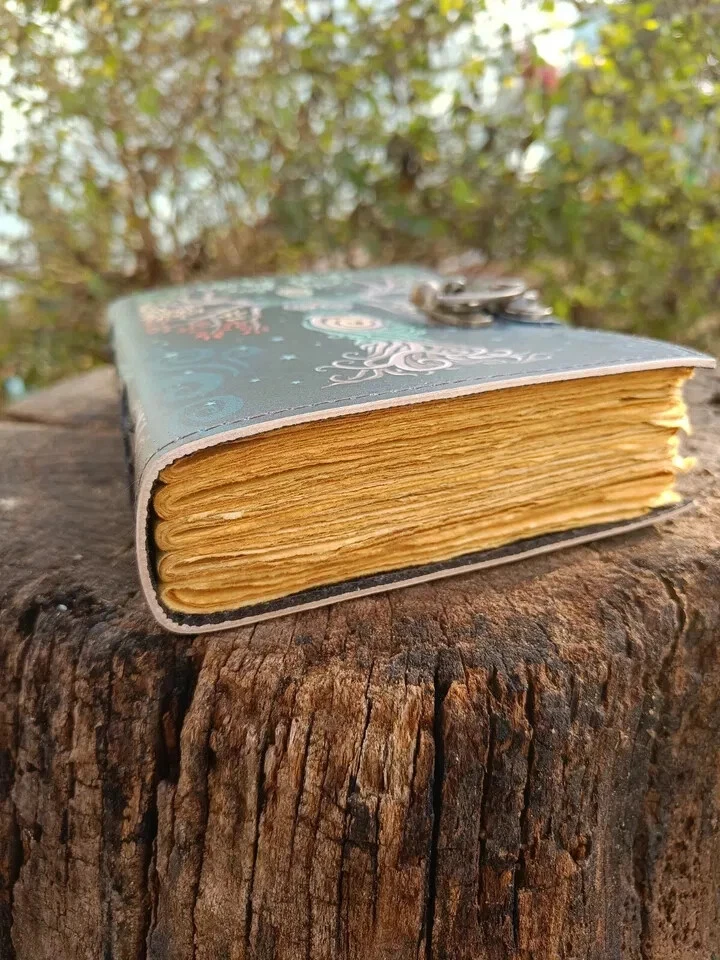 Features: * Material: Leather & Recycled Paper. * Size: approx. 7 x 5 inches * handmade khadda paper, made from recycled cotton. *Page : 200 (counting both side) * A very beautiful gift for yourself or your friends. * Great diary, travel journal and notebook. FAQ: More About Us: We are a Fair Trade company and regularly visit our suppliers to ensure the highest standards are met. We pay our suppliers 50% upfront and send money to them whenever they need it and we never send anything back, even if it’s damaged. To incentivise the staff, we have a bonus system in place, and they can earn up to 5% of our total order value, which can equate to an extra month’s wages per year. Where are your journals made? These handmade journals are made by a small family business in Rajasthan, India. How many pages does the journal come with and what is it made of? These medium leather journals have 125 pages of handmade khadda paper, made from recycled cotton (also known as kaddi or khaddi) that has been left over from the massive garment industry in India. They are handmade and don’t contain chemicals as we only use unbleached cotton. The paper is made by a charity in rural Rajasthan that promotes women’s education and their social standing in rural villages. How are the journals made? The leather has been tanned by our suppliers and the journals have been crafted using a mixture of love, contemporary and traditional skills. The embossing has been expertly created using small individual handmade tools making each journal unique. The pages have been bound by hand, so they are strong and perfect for travelling Due to the nature of these leather journals the embossed pattern might not be the same as on the image. Each item is individual, leather is a natural product and can have slight imperfections, we feel this adds to the individuality and makes each product unique. For embossed items, the exact pattern will not be the same as the sample image shown but all products have been made with the same handmade. What can I use the journal for? They are perfect to use as a scrapbook or art book, doodle book or diary, and the paper is great for water-colour painting. Anything else I should know? Due to the fact that these products are individual, rustic and handmade, the colour and designs may slightly vary but loveliness comes as standard. PLEASE NOTE: We do not advise using a fountain pen with this type of handmade paper as the ink may spread. When can I expect my delivery? We aim to process and dispatch your delivery on the same day. Please allow up to 1 working days to receive this.