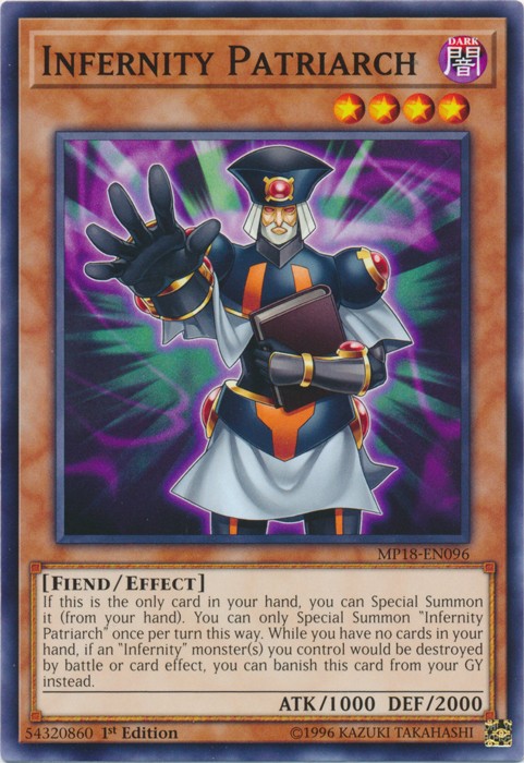 Infernity Patriarch - MP18-EN096 - Common - 1st Edition Image is a stock photo of the card. You will receive the card in Moderately Played condition Condition: Moderately Played ATK/DEF : 1000/2000 Attribute : Dark Card Number : MP18-EN096 Card Rules : Card Text : If this is the only card in your hand, you can Special Summon it (from your hand). You can only Special Summon "Infernity Patriarch" once per turn this way. While you have no cards in your hand, if an "Infernity" monster(s) you control would be destroyed by battle or card effect, you can banish this card from your GY instead. Card Type : Effect Monster Edition : 1st Level : 4 Monster Type : Fiend Name : Infernity Patriarch Passcode : 54320860 Pendulum Scale : Rarity : Common Set : 2018 Mega-Tin Mega Pack Be sure to visit our store for a wide selection of your favorite cards! We are running specials RIGHT NOW!! Shipping Options: ~Ships in a regular white envelope with a stamp for FREE! (THERE IS NO TRACKING INFORMATION AVAILABLE FOR THE ABOVE METHOD. SHIPPING TIME IS 4-10 BUSINESS DAYS) ~Ships in a TRACKEDbubble mailer for $5.99! ~Shipments are handled same or next business day. ~FREE SHIPPING for each additional card, so shop around our store!