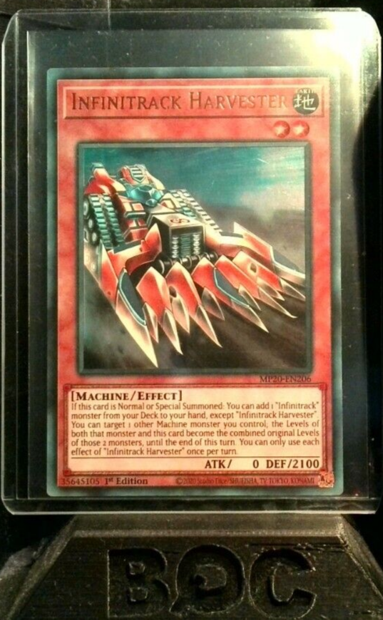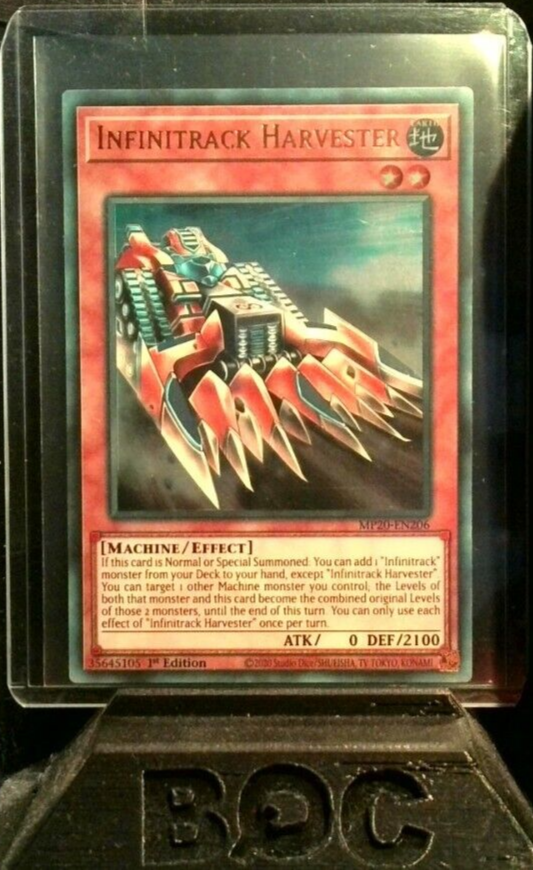 This Ultra Rare Infinitrack Harvester card is a must-have for any Yu-Gi-Oh! collector. With a defense of 2100 and an attack of 0, this Machine creature card is made of high-quality card stock and features a holographic finish. From the 2020 Mega-Tin: Lost Memories set, this 1st Edition card is in Near Mint or Better condition and is in English language. The card size is standard and it is an Effect type card. Don't miss out on the chance to add this rare card to your collection. Card Text: If this card is Normal or Special Summoned: You can add 1 "Infinitrack" monster from your Deck to your hand, except "Infinitrack Harvester". You can target 1 other Machine monster you control; the Levels of both that monster and this card become the combined original Levels of those 2 monsters, until the end of this turn. You can only use each effect of "Infinitrack Harvester" once per turn.