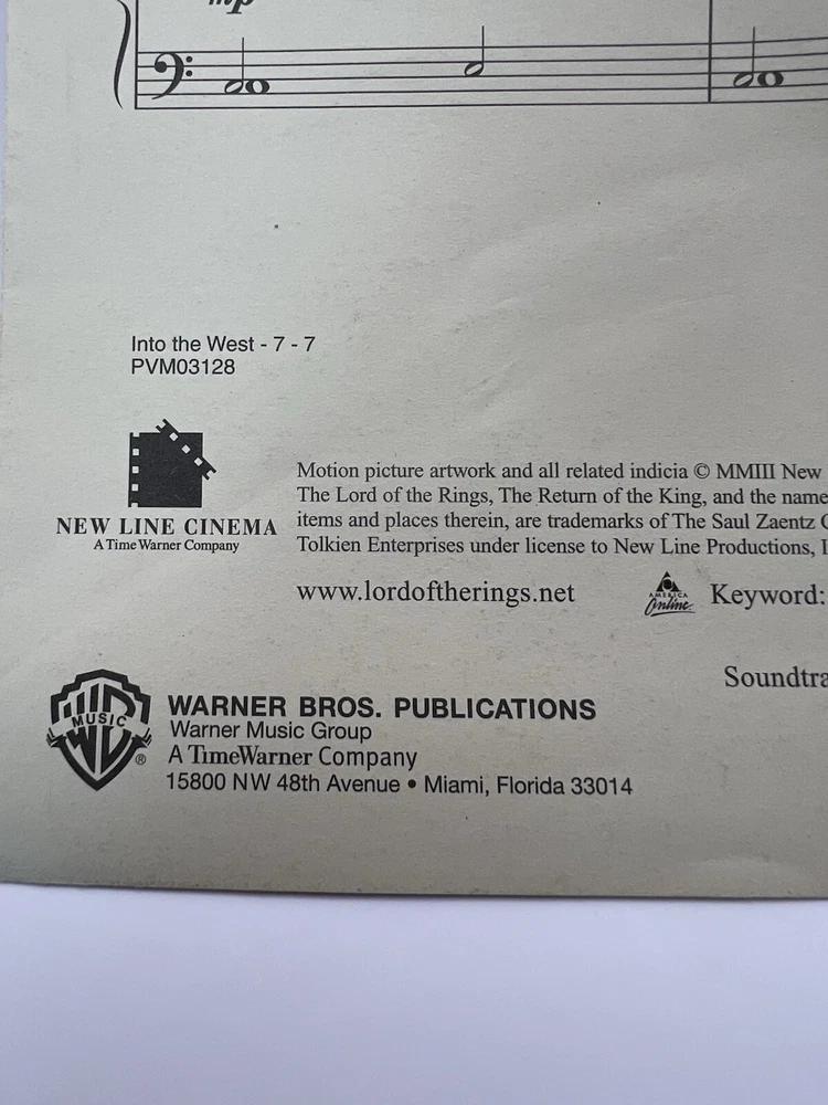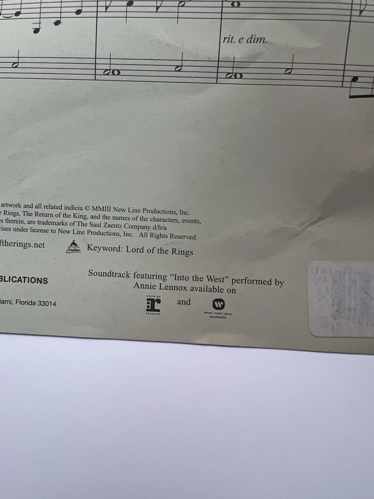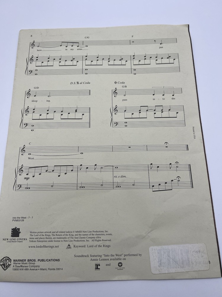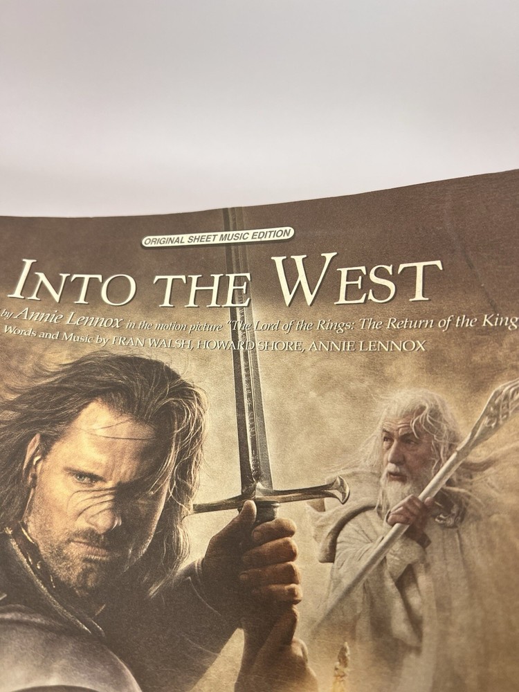 Into The West Lord Of The Rings Original Sheet Music Edition By Annie Lennox There are a couple of small tears on the front from a sales sticker or some other type of sticker that was removed. Please review all photos to fully assess this item and its condition. If you have any questions please message me!