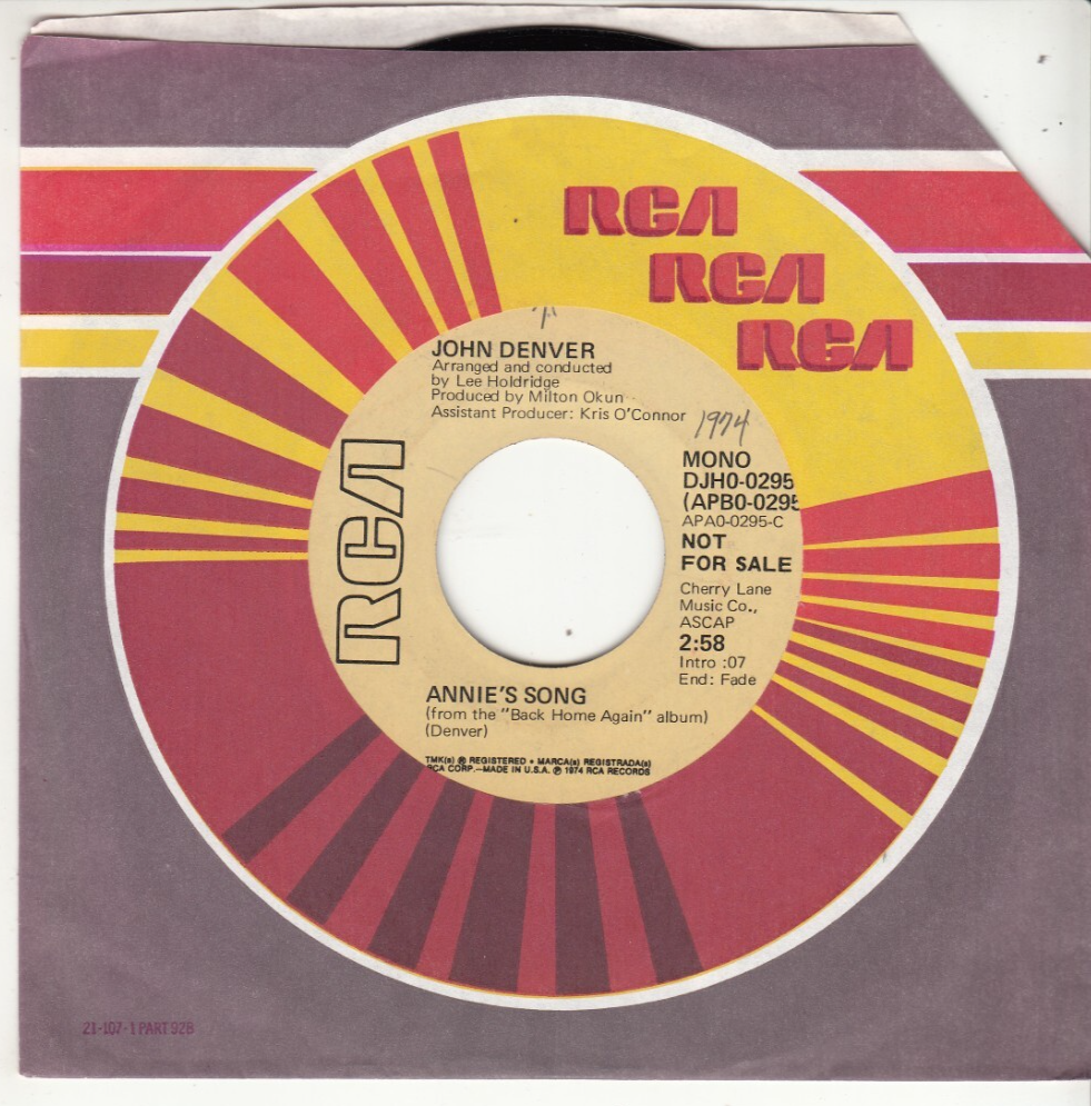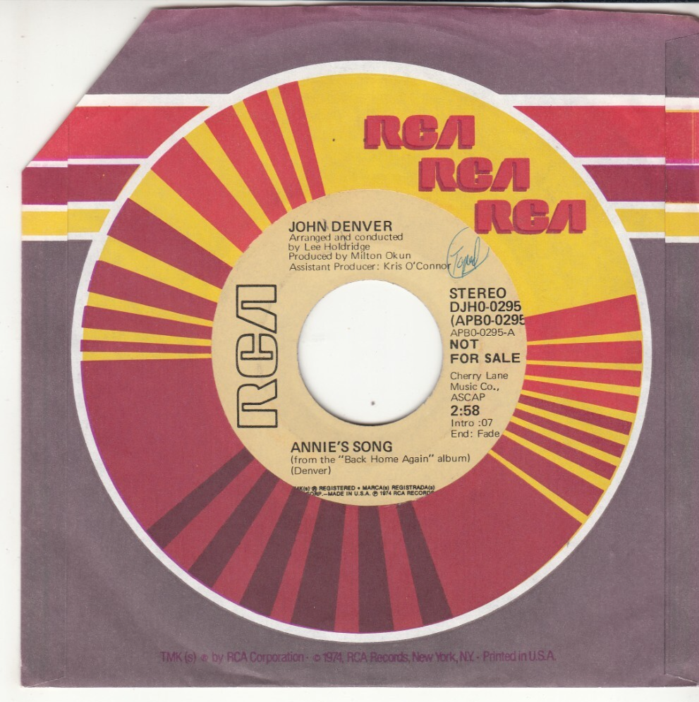 Here is a Nice ORIGINAL USA PROMO 45 from JOHN DENVER. 1974 ... RCA RECORDS 0295. SONGS Include: ANNIE'S SONG (MONO) .... B/W .... ANNIE'S SONG (MONO) Labels: NICE SHAPE - SEE PHOTOS FOR DETAILS. Condition of this 45 (Visually Graded): EX RECORD. SORRY FOR THE MAJOR INCREASE IN POSTAGE FOR MY INTERNATIONAL CUSTOMERS. THE US POST OFFICE JUST INCREASED RATES BY OVER 40% FOR INTERNATIONAL SHIPMENTS. THAT PLUS PAYPAL AND EBAY TAKING FEES ON THE PRICE OF POSTAGE HAS CAUSED THE PRICE TO SHIP INTERNATIONALLY TO $14 FOR ONE RECORD. SO IF YOU ARE AN INTERNATIONAL CUSTOMER, IT IS BEST TO BUY MORE THAN 5 OR 10 OR EVEN 15 RECORDS BECAUSE I CAN SHIP THEM PRIORITY FLAT RATE INTERNATIONAL FOR $24. I WILL COMBINE POSTAGE FOR MULTIPLE LOT WINNERS - EMAIL IF YOU ARE BIDDING ON OTHER LOTS AND I WILL TRY TO ACCOMODATE. CHECK OUT MY OTHER AUCTIONS. I WILL BE CONTINUALLY SELLING ITEMS RIGHT OUT OF MY OWN PERSONAL COLLECTION. EVERYTHING IS IN VERY NICE SHAPE. BID WITH CONFIDENCE. YOU WILL NOT BE DISAPPOINTED. POSTAGE: COMBINING POSTAGE IS JUST FINE. YOU SHOULD CONTACT ME WHEN READY AS EBAY DOES NOT ADD UP COMBINING RATE SO PLEASE ASK ME WHEN READY. I WILL THEN INVOICE YOU. I CANNOT refund over payments on postage because eBay will NOT refund to me.