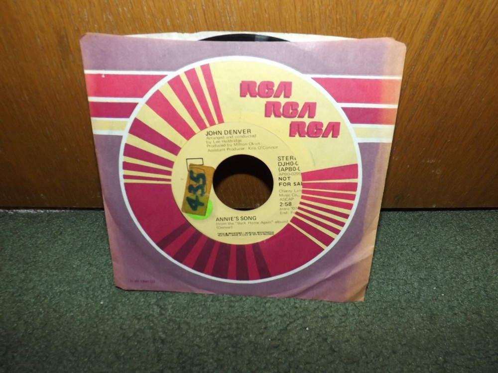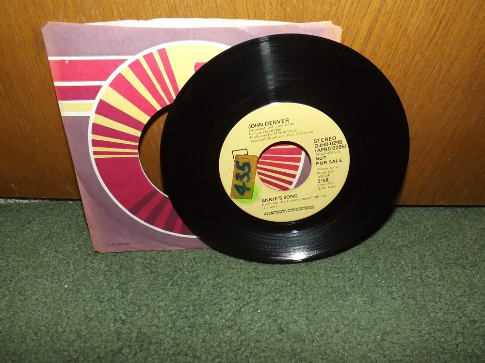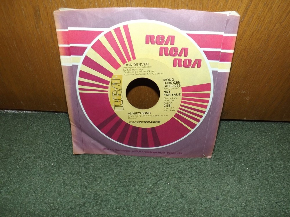 Always wished this record from my personal collection of collectible 45s was in better condition, but I turn 69 next week and I am continuing my slow trek to sell my collection on eBay. Today, I'm adding what appears to be a radio DJ copy of John Denver's 1974 smash hit Annie's Song from the "Back Home Again" album. It was probably played a ton of times, thus the light scratches and the stickers on the stereo side. Both sides are labeled NOT FOR SALE Both sides are DJH0-0295 with the stereo side being APB0-0295-A and the mono side being APA0-0295-C. Any questions, please ask. I only ship via ground advantage -- no media mail as media mail has no insurance.