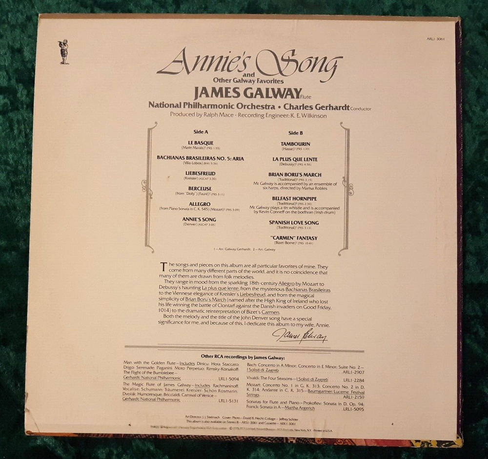 This is a very nice copy of the 1978 album "Annie's Song" by James Galway. Purchased used by my parents in the 1980s and in our possession since. Record is in solid condition. I have listen tested this LP, as I do every piece of vinyl I offer, and I try to be conservative, but I will rate the vinyl and the cardboard sleeve as VG. Everybody has a different perspective of condition, but this is a very nice old record. It's almost 45 years old and could certainly benefit from a deep cleaning, but you won't be disappointed by the listening experience. Sleeve still has plastic cover from new. In my family for decades, and now ready to join your collection for your listening pleasure! The photos are of the very LP you are bidding on, not a "similar" item. I will gladly provide further photos or information about this piece until you are comfortable. If you do have any concern with a purchase from me, please contact me and lets talk. I offer good quality merchandise, and I think my Ebay rating speaks for itself. If you order multiple items I will gladly combine shipping and refund a portion of your shipping cost. Orders received between 12:00 PM on Friday and Monday morning will ship Monday. All other orders will ship within 24 hours, and I will provide a tracking number at time of shipment. I will ship to Alaska and Hawaii on request but shipping would have to be computed. I do not ship internationally. I ship only to Ebay verified addresses. Shipping via US Post.