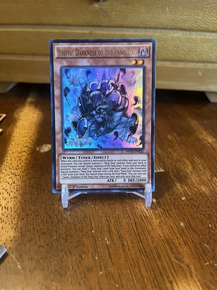This Yu-Gi-Oh! TCG card features Jiaotu, Darkness of the Yang Zing, a powerful and highly sought-after card among collectors. Its dark coloration adds to its mystique and allure, making it a must-have for any serious CCG player. The card is ungraded, but this should not detract from its value and desirability. With its impressive attributes and rarity, it is sure to become a prized addition to any collection. Don't miss your chance to own this incredible card!