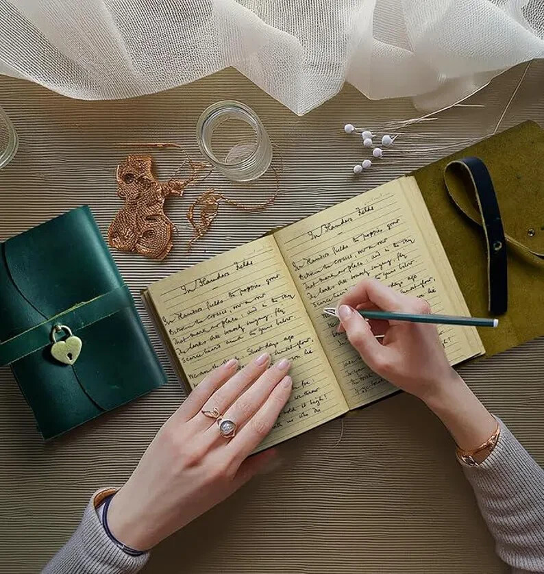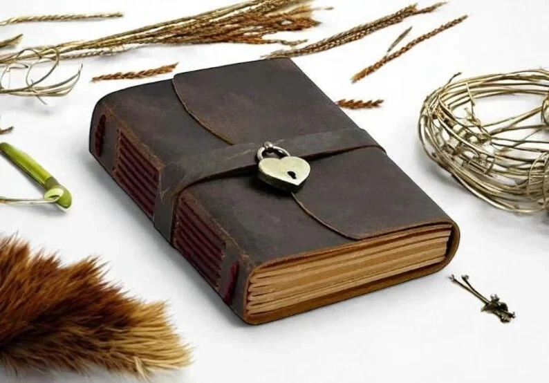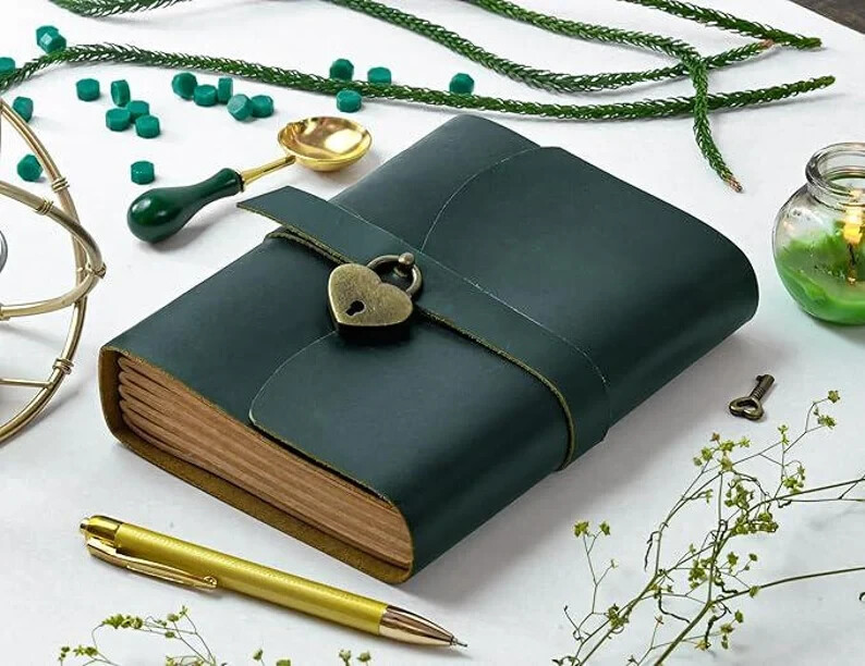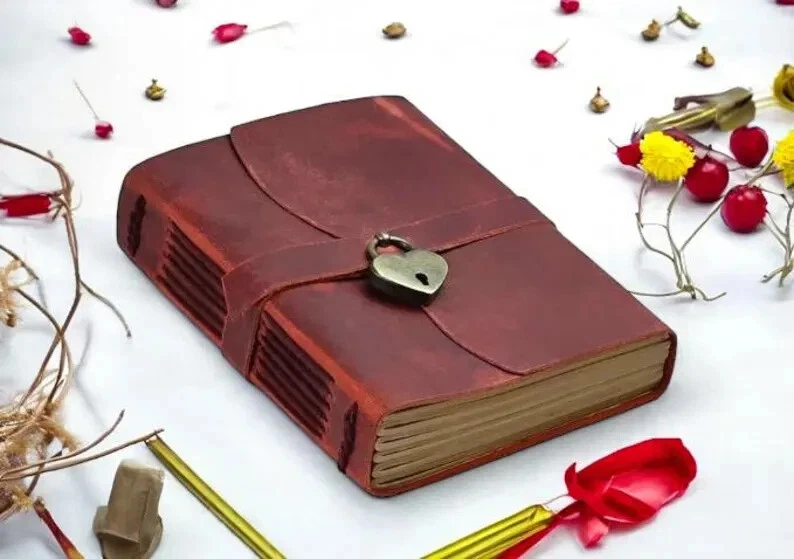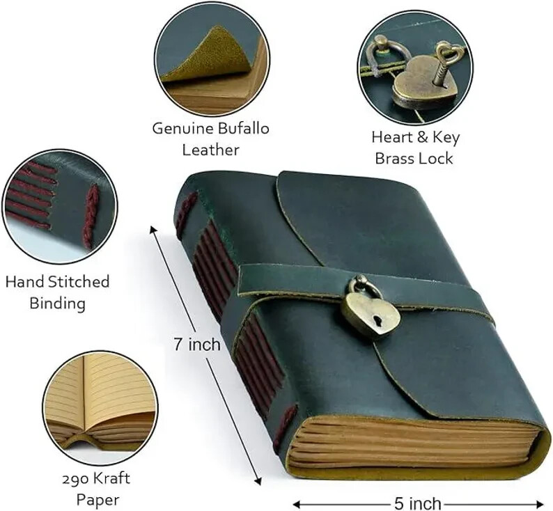 Vintage Handmade Leather Journal Diary Notebook Discover the perfect blend of vintage charm and modern functionality with our Handmade Leather Journal. Crafted from high-quality, genuine leather, this 7x5-inch journal exudes timeless elegance, making it an ideal companion for your daily reflections, creative writing, or note-taking. Journal for Women Daily Diary with Lock and Key, Personalized Journal Gift for Children, Daughter, Mother's Day Gift Lined journal The journal features two types of paper: Deckle-Edged Paper for an authentic, rustic feel, and Crafts Line Paper for a more structured writing experience. Whether you're jotting down thoughts, sketching, or organizing your tasks, this journal offers the perfect canvas for your creativity. Product Features: availaible in four Colours Journal Handmade Leather Cover: Each journal is meticulously crafted from genuine leather, providing durability and a soft, luxurious feel. Dual Paper Options: Includes deckle-edged paper for a vintage look and crafts line paper for neat, organized writing. Compact & Portable: The 7x5-inch size makes it easy to carry with you wherever you go. Vintage Aesthetic: Perfect for lovers of all things vintage, with a design that complements any style. Secure Closure: The wrap-around leather strap ensures your journal stays closed and your thoughts remain private. Handcrafted Quality: Each journal is made by skilled artisans, ensuring unique character and unmatched quality. Perfect Gift for Women: Ideal for Writers: A thoughtful gift for any woman who loves to write, journal, or sketch. Special Occasions: Perfect for birthdays, anniversaries, or as a holiday gift. Personal & Meaningful: Give a gift that encourages creativity and self-expression. Versatile Use: Whether it's used as a diary, planner, or travel journal, this notebook will be cherished. Embrace the art of journaling with a beautiful, vintage-style notebook that’s as unique as your thoughts.