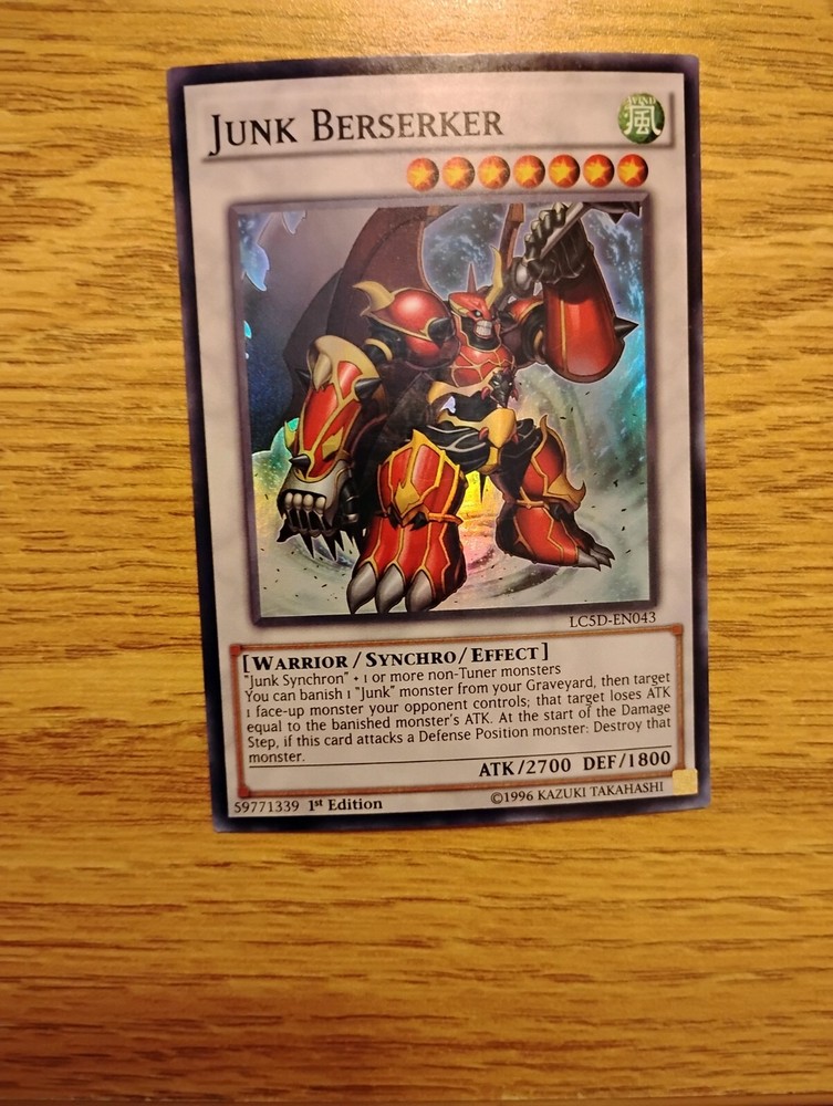The "Junk Berserker" card is a Super Rare Synchro Effect card from the Legendary Collection 5D's set in the Yu-Gi-Oh! TCG. It features a Warrior monster type with a powerful Attack/Power of 2700 and a Defense/Toughness of 1800. This 1st Edition card is specifically from the English language version and manufactured by Konami. It is a valuable addition to any player's deck, especially for those who focus on Wind attribute cards.