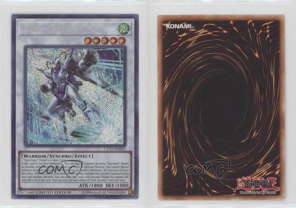 2018 Yu-Gi-Oh! Mega-Tins Jaden Yuki - [Base] - Limited Edition #CT15-EN002 Junk Speeder (SE) COMC Item: 125104417 - YuGiOh Card Search for more: 2018 Yu-Gi-Oh! Mega-Tins Jaden Yuki Search for more: 2018 Yu-Gi-Oh! Mega-Tins Jaden Yuki - [Base] - Limited Edition View all of our Listings Auctions Buy It Now About Us Located in the beautiful Pacific Northwest, COMC (Check Out My Cards) is the world's largest consignment service for trading card singles. More than 10,000 people have used our consignment service to list over 50 million trading cards. Find out how we can help you consign your items on eBay by contacting us through eBay messaging. COMC -- "The Safe & Easy Way to Buy & Sell" Raw Condition for Modern Cards Unless otherwise noted, raw modern cards are listed in Near Mint-Mint condition or better. A NM-MT card appears to be Mint at first glance, but upon closer inspection, may exhibit some of the following: minor print defects (e.g. roller marks, print line, dimple), minor scratches, slight edge wear, and slight corner wear. Centering is clearly visible in the images provided and does not factor into our condition assessment. Raw Condition for Vintage Cards Unless otherwise noted, raw vintage cards are listed in Excellent condition or better. An EX card may exhibit some of the following: minor rounding of corners, surface wear, print defects, light scratches, and slight edge wear/chipping. Centering is clearly visible in the images provided and does not factor into our condition assessment. Domestic Shipping Combined shipping for multiple items is available. To receive combined shipping, please ensure all desired items are in your eBay shopping cart before proceeding to checkout. eBay limits orders to 40 items per order. We automatically combine multiple orders placed on the same day. If you place multiple orders on the same day, please contact us to request a refund of applicable shipping costs. Signature confirmation may be required on invoices over $400. All cards are protected and shipped securely. International Shipping COMC offers eBay's International Shipping (EIS) for international orders under $2,500* (see country exceptions below). All duties and import fees are paid at checkout; in the rare event that there are additional import fees upon delivery, these are borne by the buyer. EIS packages route through a shipping hub in Erlanger, KY before shipping to their final destination. Please note that EIS does not allow for combined shipments. The shipping rates are determined by eBay and cannot be adjusted. *Maximum sale price exceptions: Colombia, Kuwait ($2,000); Taiwan ($1,539); Chile, Costa Rica, Guatemala, Honduras, Trinidad and Tobago ($1,000); Antigua and Barbuda, Aruba, Belize, Dominica, Grenada, Philippines, Saint Kitts and Nevis, Saint Lucia, Montserrat, Turks and Caicos Islands ($500); Dominican Republic, El Salvador ($200). Please request a shipping quote through eBay messaging for orders that exceed the maximum sale price supported by eBay's International Shipping. You will be responsible for all duties and import fees for international orders shipped outside the EIS. All cards are protected and shipped securely. Payment COMC does not accept offers on our cards through our eBay storefront. COMC utilizes eBay’s managed payments system. If you are experiencing difficulties making a payment, please contact eBay for assistance. Return Policy Returns are only accepted on the rare occasion the item is not as described. If you are making a return, please initiate the return process through eBay so a mailing label can be provided for you. Prior to listing, our expert team carefully assessed this item to represent it accurately. Please review the description and high-definition images prior to purchasing to ensure this item meets your satisfaction. We welcome you to contact us if you have further questions about this item. Trust and Integrity COMC carefully assesses each item consigned to us to prevent fraudulent items from entering the marketplace. If you believe an item offered on COMC may be fraudulent, please contact us with details so we can investigate the issue. Items we determine are outside our supported items policy may be removed. Last Modified: 6/3/2025 11:59:07 PM PDT