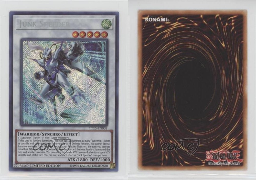 2018 Yu-Gi-Oh! Mega-Tins Jaden Yuki - [Base] - Limited Edition #CT15-EN002 Junk Speeder (SE) COMC Item: 169670691 - YuGiOh Card Search for more: 2018 Yu-Gi-Oh! Mega-Tins Jaden Yuki Search for more: 2018 Yu-Gi-Oh! Mega-Tins Jaden Yuki - [Base] - Limited Edition View all of our Listings Auctions Buy It Now About Us Located in the beautiful Pacific Northwest, COMC (Check Out My Cards) is the world's largest consignment service for trading card singles. More than 10,000 people have used our consignment service to list over 50 million trading cards. Find out how we can help you consign your items on eBay by contacting us through eBay messaging. COMC -- "The Safe & Easy Way to Buy & Sell" Raw Condition for Modern Cards Unless otherwise noted, raw modern cards are listed in Near Mint-Mint condition or better. A NM-MT card appears to be Mint at first glance, but upon closer inspection, may exhibit some of the following: minor print defects (e.g. roller marks, print line, dimple), minor scratches, slight edge wear, and slight corner wear. Centering is clearly visible in the images provided and does not factor into our condition assessment. Raw Condition for Vintage Cards Unless otherwise noted, raw vintage cards are listed in Excellent condition or better. An EX card may exhibit some of the following: minor rounding of corners, surface wear, print defects, light scratches, and slight edge wear/chipping. Centering is clearly visible in the images provided and does not factor into our condition assessment. Domestic Shipping Combined shipping for multiple items is available. To receive combined shipping, please ensure all desired items are in your eBay shopping cart before proceeding to checkout. eBay limits orders to 40 items per order. We automatically combine multiple orders placed on the same day. If you place multiple orders on the same day, please contact us to request a refund of applicable shipping costs. Signature confirmation may be required on invoices over $400. All cards are protected and shipped securely. International Shipping COMC offers eBay's International Shipping (EIS) for international orders under $2,500* (see country exceptions below). All duties and import fees are paid at checkout; in the rare event that there are additional import fees upon delivery, these are borne by the buyer. EIS packages route through a shipping hub in Erlanger, KY before shipping to their final destination. Please note that EIS does not allow for combined shipments. The shipping rates are determined by eBay and cannot be adjusted. *Maximum sale price exceptions: Colombia, Kuwait ($2,000); Taiwan ($1,539); Chile, Costa Rica, Guatemala, Honduras, Trinidad and Tobago ($1,000); Antigua and Barbuda, Aruba, Belize, Dominica, Grenada, Philippines, Saint Kitts and Nevis, Saint Lucia, Montserrat, Turks and Caicos Islands ($500); Dominican Republic, El Salvador ($200). Please request a shipping quote through eBay messaging for orders that exceed the maximum sale price supported by eBay's International Shipping. You will be responsible for all duties and import fees for international orders shipped outside the EIS. All cards are protected and shipped securely. Payment COMC does not accept offers on our cards through our eBay storefront. COMC utilizes eBay’s managed payments system. If you are experiencing difficulties making a payment, please contact eBay for assistance. Return Policy Returns are only accepted on the rare occasion the item is not as described. If you are making a return, please initiate the return process through eBay so a mailing label can be provided for you. Prior to listing, our expert team carefully assessed this item to represent it accurately. Please review the description and high-definition images prior to purchasing to ensure this item meets your satisfaction. We welcome you to contact us if you have further questions about this item. Trust and Integrity COMC carefully assesses each item consigned to us to prevent fraudulent items from entering the marketplace. If you believe an item offered on COMC may be fraudulent, please contact us with details so we can investigate the issue. Items we determine are outside our supported items policy may be removed. Last Modified: 6/3/2025 11:59:01 PM PDT