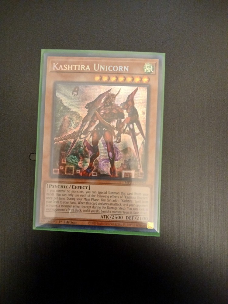 This is a mint condition of the card Kashtira Unicorn from the set 25th Anniversary Tin: Dueling Heroes Mega Pack. It is MP23-EN164 and is a Prismatic Secret Rare. This card has never been played and only has been in the binder with a sleeve. It will be shipped with the sleeve and top loader.