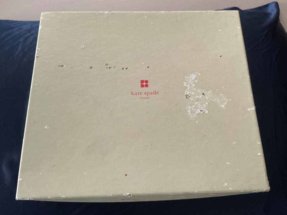 This vintage scrapbook/notebook by Kate Spade New York is a must-have for any stationery or collectible lover. The leather cover material is durable and elegant, while the vellum page inserts add a touch of luxury. The book is blank, making it perfect for personal use or as a gift. The item is a great addition to any collection of blank diaries and journals, calendars and planners, or office supplies. Made in Italy, this Kate Spade notebook is a high-quality product that will last for years to come. This item will ship in its original box. The box is somewhat beat up, and gives good protection to the scrapbook/notebook.