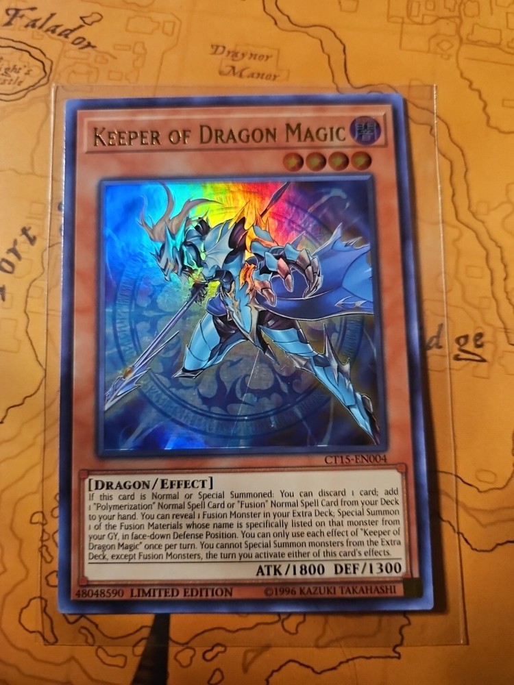 This limited edition Keeper of Dragon Magic card is a must-have for any Yu-Gi-Oh! TCG collector. With a dark color and dragon creature/monster type, this ultra rare card features an attack/power of 1800 and defense/toughness of 1300. The card is an effect type and belongs to the 2018 Mega-Tins set, manufactured by Konami. The card number is CT15-EN004 and it is in English language. This card is perfect for any fan of the Yu-Gi-Oh! TCG game, with its unique features and rarity. It is a great addition to any collection and is sure to impress. Don't miss out on the chance to own this limited edition Keeper of Dragon Magic card.