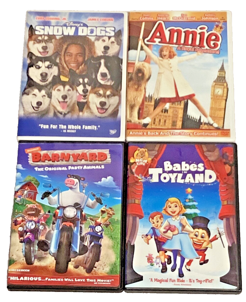 This collection of DVDs includes the following: Disney's Snow Dogs Annie: A Royal Adventure Nickelodeon Barnyard Babes in Toyland...