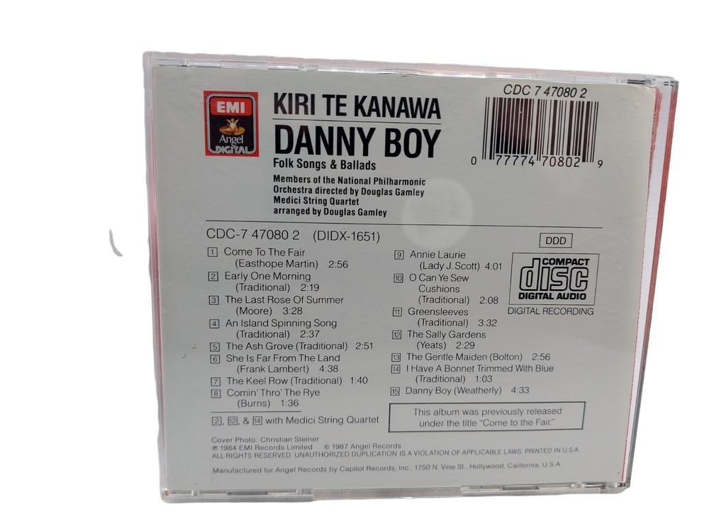 Cd has sticker residue on cover. Kiri Te Kanawa Danny Boy Greensleeves Annie Laurie 1987 CD. Come to the fair. Early one morning. The last rose is summer. An island spinning song. The ash grove. She is far from the land. The keel road. Comes through the rye. Annie Laurie. OK ye sew cushions. Greensleeves. The Sally gardens. The gentle maiden. I have a bonnet trimmed with blue. Danny Boy. Album was previously released under the title "Come to the fair"