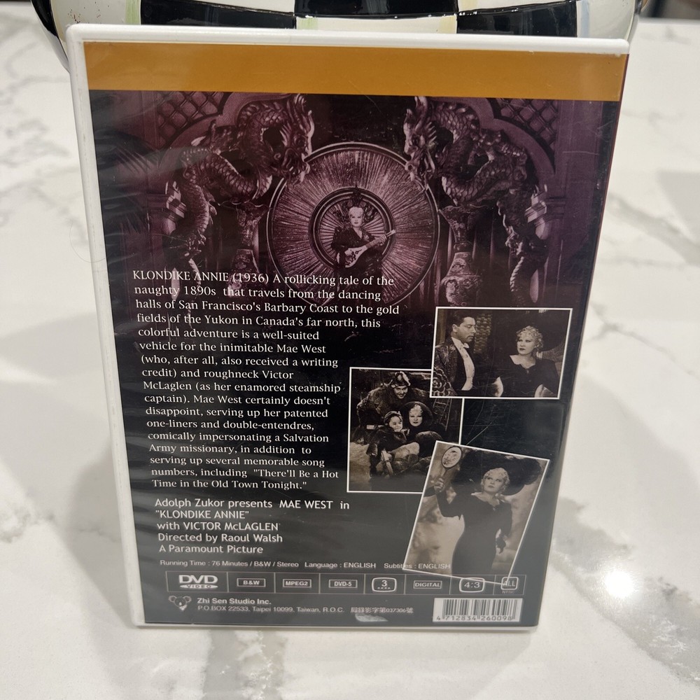 Disk looks great! Tested and working! Ships free. Experience the classic comedy of Klondike Annie, starring the talented Mae West and directed by Raoul Walsh. This DVD version of the 1936 film is a must-have for any movie collector or fan of vintage cinema. Enjoy the witty humor and captivating storyline of this beloved movie. With its stellar cast and top-notch direction, Klondike Annie is sure to entertain audiences of all ages. Add this DVD to your collection today and enjoy a piece of cinematic history.