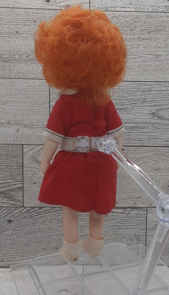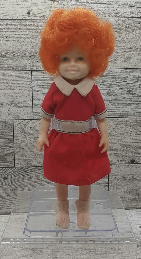 This vintage 1982 Knickerbocker Little Orphan Annie doll is a must-have for any fan of the franchise. The 6-inch plastic doll features red hair and comes dressed in her signature dress with socks. Shes in great condition but does not have her shoes. Perfect for collectors, this play doll is in great condition and has been well-maintained. The packaging is not included, but the doll is sure to bring joy to anyone who loved the iconic character. Display stand not included.
