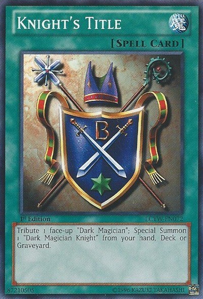 Knight's Title - LCYW-EN072 - Common - Unlimited Edition Image is a stock photo of the card. You will receive the card in Heavily Played condition Condition: Heavily Played ATK/DEF : Attribute : Spell Card Number : LCYW-EN072 Card Rules : Card Text : Activate this card by offering 1 face-up "Dark Magician" on your side of the field as a Tribute. Special Summon 1 "Dark Magician Knight" from your hand, Deck or Graveyard. Card Type : Normal Spell Edition : Unlimited Level : Monster Type : Name : Knight's Title Passcode : 87210505 Pendulum Scale : Rarity : Common Set : Legendary Collection 3: Yugi's World Be sure to visit our store for a wide selection of your favorite cards! We are running specials RIGHT NOW!! Shipping Options: ~Ships in a regular white envelope with a stamp for FREE! (THERE IS NO TRACKING INFORMATION AVAILABLE FOR THE ABOVE METHOD. SHIPPING TIME IS 4-10 BUSINESS DAYS) ~Ships in a TRACKEDbubble mailer for $5.99! ~Shipments are handled same or next business day. ~FREE SHIPPING for each additional card, so shop around our store!