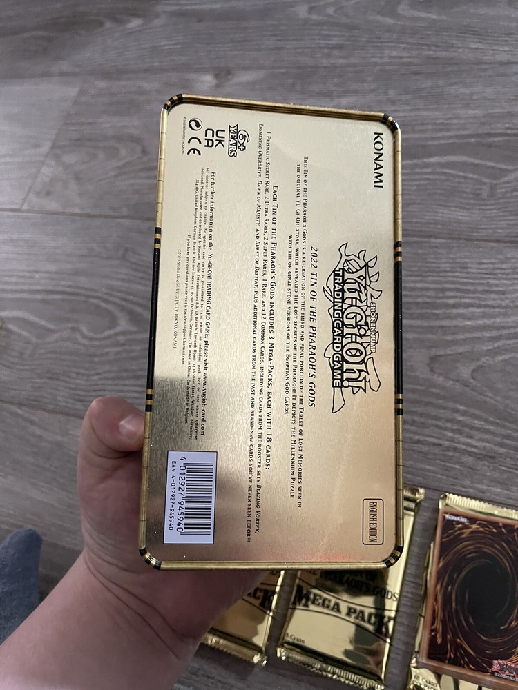 Konami Yu-Gi-Oh! TCG 2022 Tin of the Pharaoh’s Gods Mega Set. Box is opened and is dented 1 x packet opened (see all cards included in photo) 2 x sealed packs Quick dispatch with shipping via Royal Mail