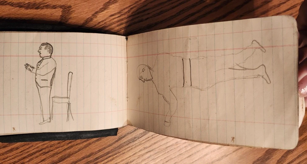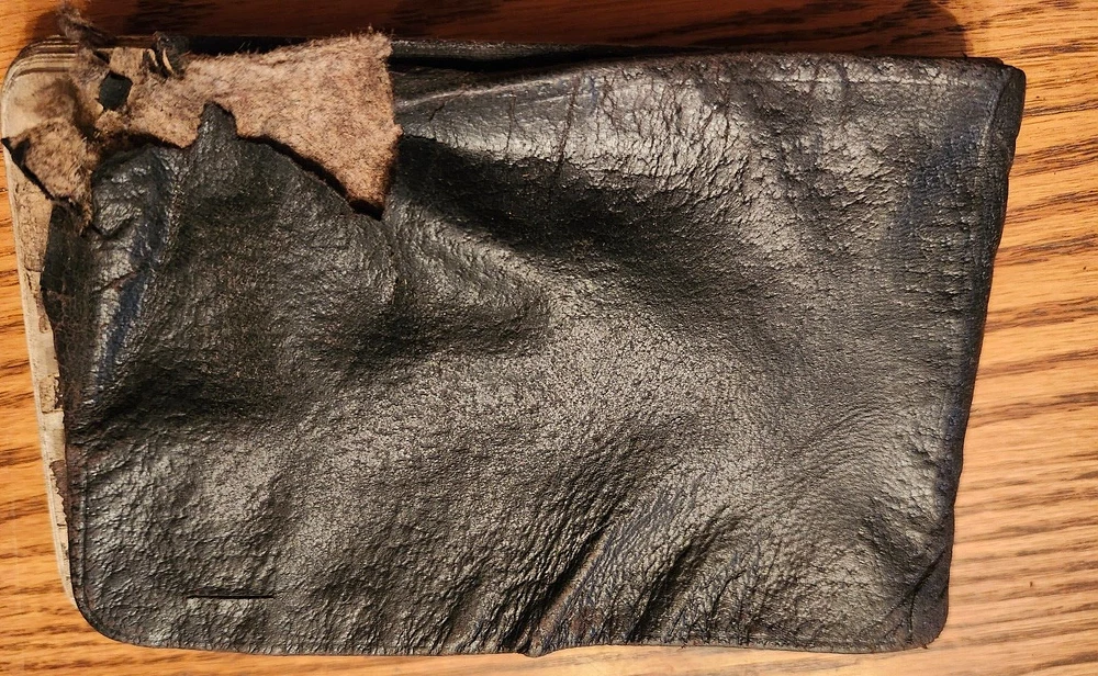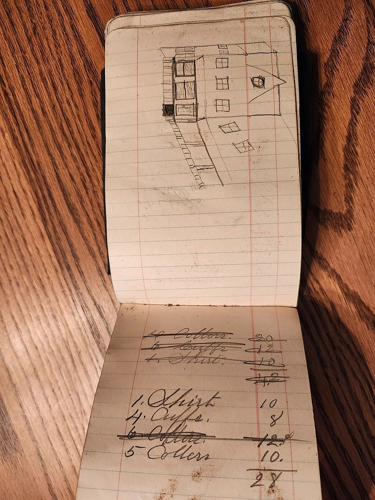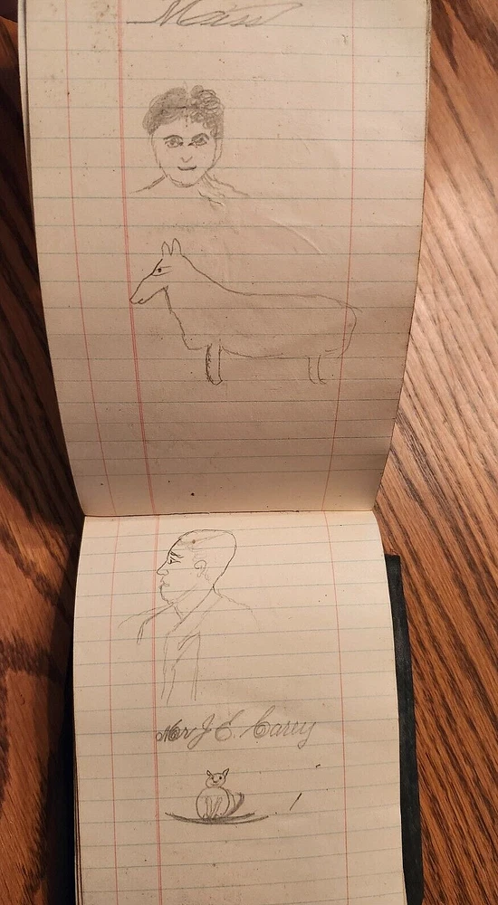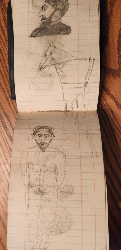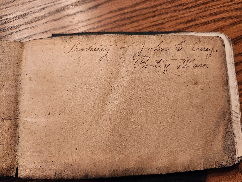 Interesting journal of John E. Carey of Boston, Mass. One reference to date found--- 1929. Contains 75 pages, two sided so 150 pgs. Approx 4 x 6". Cover is black leather in condition as shown--tears, separation and rippling. Cover had a storage pocket as well as a felt like material padding. Pages are still loosely bound except for a few. Page edges have golden finish. Guessing this was a high end, expensive journal of its time. There are few pages without writing or drawings. Very interesting, old piece.