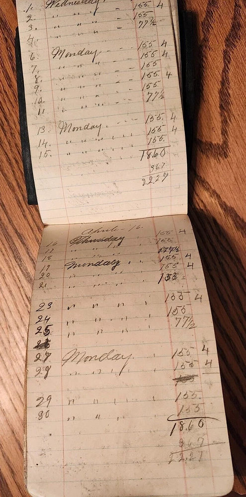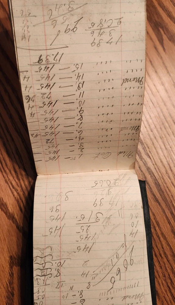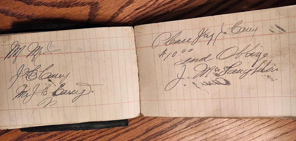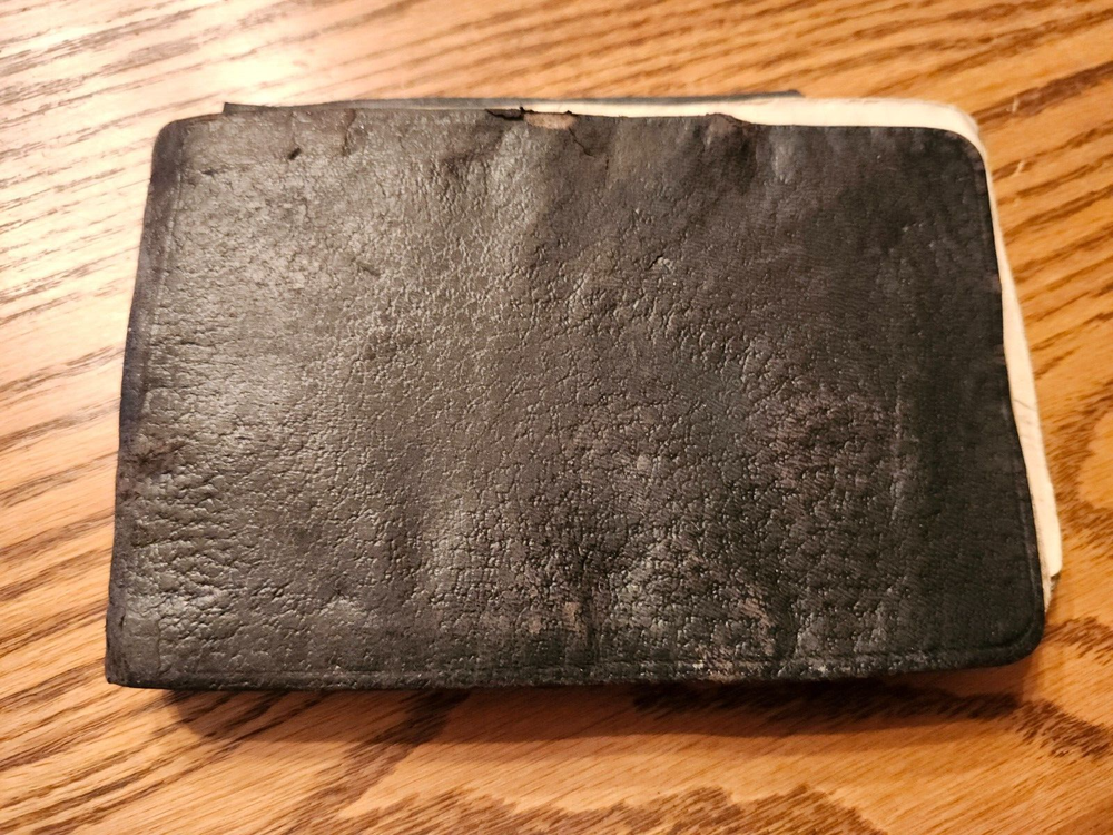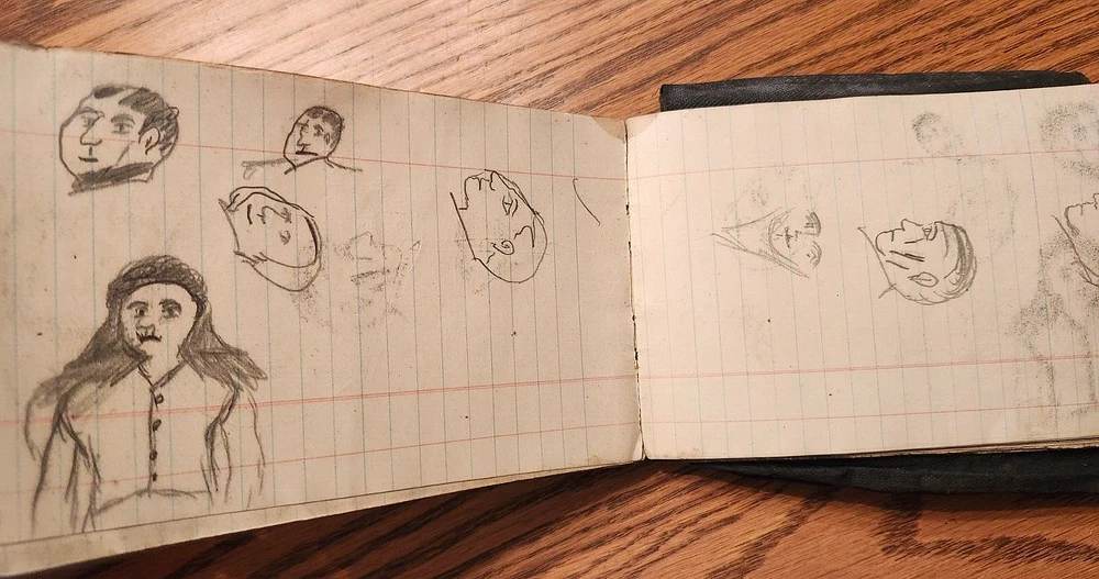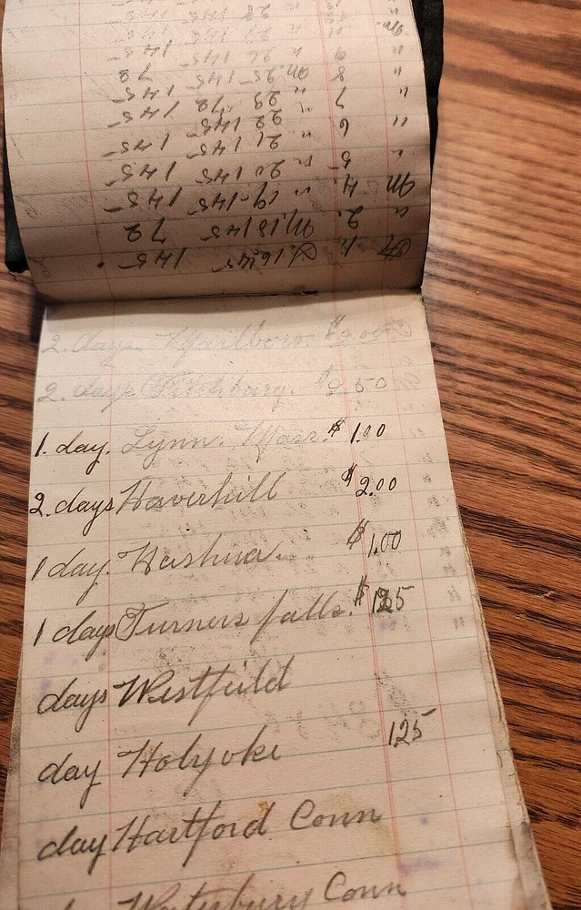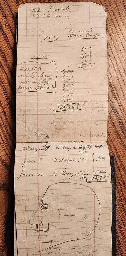 Interesting journal of John E. Carey of Boston, Mass. One reference to date found--- 1929. Contains 75 pages, two sided so 150 pgs. Approx 4 x 6". Cover is black leather in condition as shown--tears, separation and rippling. Cover had a storage pocket as well as a felt like material padding. Pages are still loosely bound except for a few. Page edges have golden finish. Guessing this was a high end, expensive journal of its time. There are few pages without writing or drawings. Very interesting, old piece.