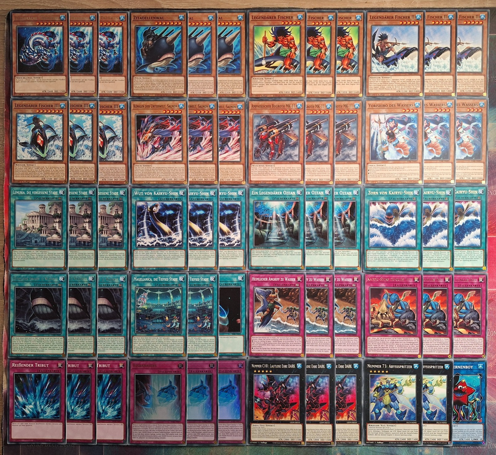 Hallo Ebayer, willkommen bei meinem Ebay Angebot. Folgendes Deckthema kannst du in diesem Angebot erwerben: LEGENDÄRER FISCHER / LEGENDARY FISHERMAN ( insgesamt 60 Karten ) Monster ( 24 ): 3x Leviadrache - Daedalus 3x Rare 3x Zitadellenwal 3x Legendärer Fischer 3x Legendärer Fischer II 3x Legendärer Fischer III 3x Königin der Unterwelt, Salmon 3x Amphibischer Burgroth MK-II 3x Yorishiro des Wassers Zauber ( 18 ): 3x Lemuria, die vergessene Stadt 3x Wut von Kairyu - Shin 3x Ein Legendärer Ozean 3x Zorn von Kairyu - Shin 3x Rare 3x Heimlicher Angriff zu Wasser II 3x Rare 2x Magellancia, die Tiefsee - Stadt 1x Landformen Fallen ( 12 ): 3x Heimlicher Angriff zu Wasser 3x Kairyu - Shins dunkles Riff 3x Rare 3x Reißender Tribut 3x Eisbarriere 1x Ultra Rare, 2x Super Rare Extradeck ( 6 ): 3x Nummer C101: Lautlose Ehre Dark 2x Nummer 73: Abyssspritzer 1x Mistar Sternenboy Das Set besteht komplett aus deutschen Karten Alle Karten sind 100% ORIGINAL Konami. Alle Karten sind im Zustand* Mint, Near Mint und Excellent ( maximal vielleicht 3-4 Karten ) Alle Karten werden knicksicher verpackt und ich verschicke Werktags innerhalb von 24 Stunden. Versandkosten: - Für dieses Angebot gilt kostenloser Versand innerhalb Deutschlands - Auf Wunsch gibt es einen versicherten DHL-Paket Versand für 2€ Mehrzahlung. For international Buyers only: - For this offer: International shipping is ALWAYS with insurance and tracking No risk for me! No risk for the Buyer! * Legende der Kartenzustände: Mint = zumeist direkt aus dem Booster ( makelos ) Near Mint = Minimale Abnutzungsspuren ( z.B. kleine Kratzer,kleine weiße Punkte oder kleine Schmutzflecken; meist kaum sichtbar ) Excellent = Kleine Abnutzungsspuren ( z.B. etwas weiße Ränder, leicht abgenutzte Ecken, kleine Schmutzflecken ) Good = Schon deutlich sichtbare Abnutzungsspuren ( z.B. stark angeschlagene Ecken, komplett weiße Ränder, verschmutzt aber ohne Knicke und turnierlegal ) Played = Ziemlich starke Abnutzungen mit Knick ( aber noch turnierlegal ) Poor = Extreme Abnutzungen mit einem oder mehreren Knicken ( nicht mehr turnierlegal ) !!! Das Bild ist ein Lagerbestandsbild von einem der hier angebotenen Sets !!! ( Ich muss das leider so schreiben,da ich dieses Set ja mehrfach anbiete. Das Foto ist somit aber ein Originalfoto von einem Set,was ich zufällig aus der Menge ausgewählt habe )