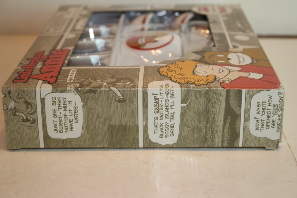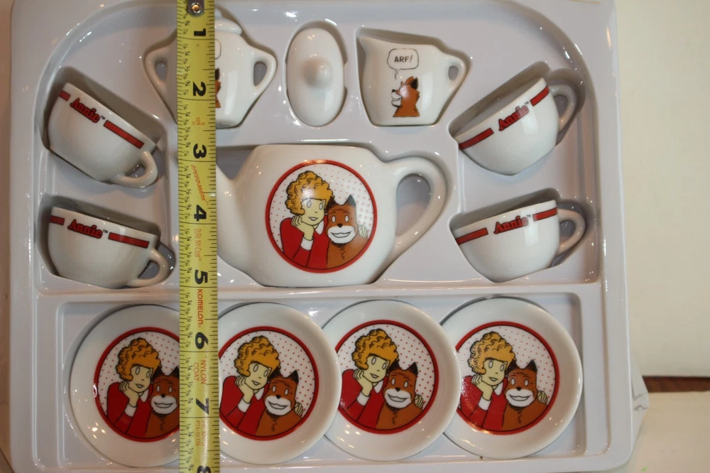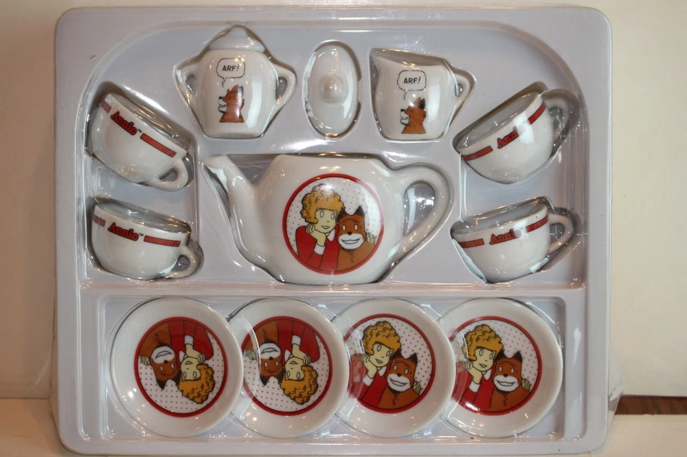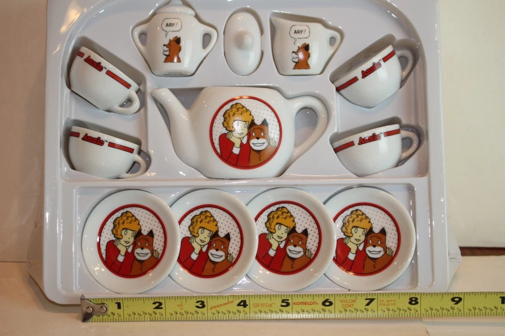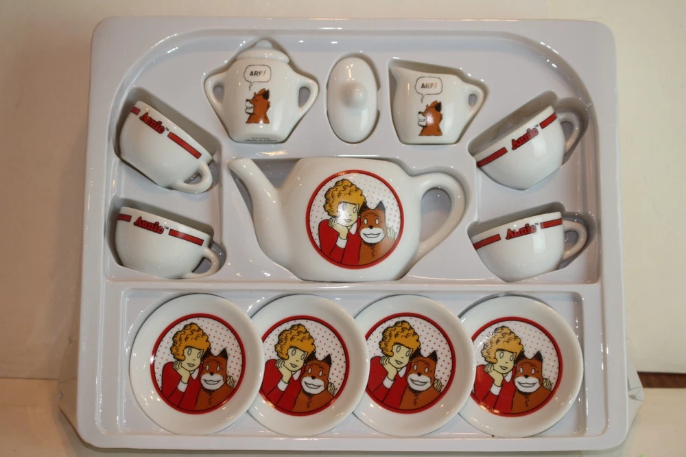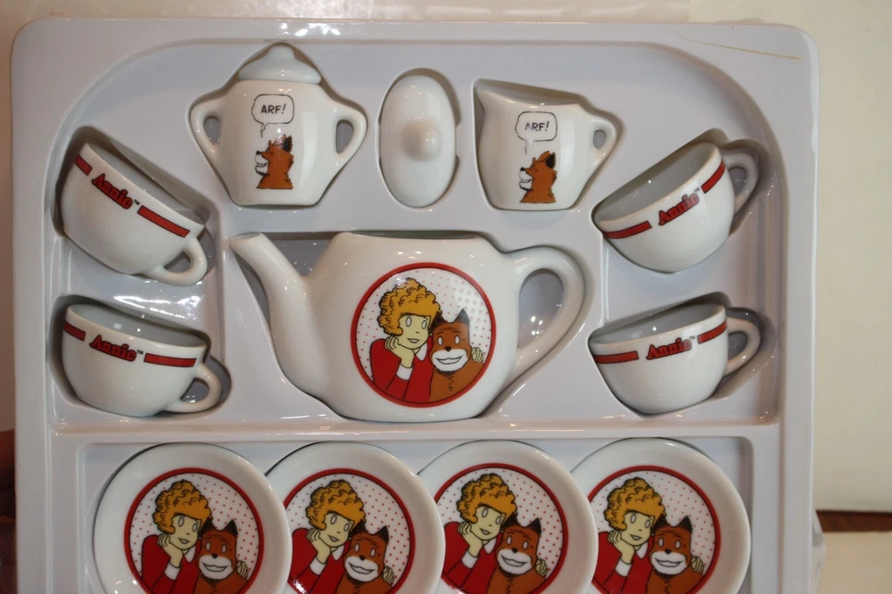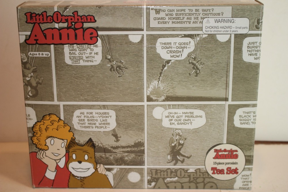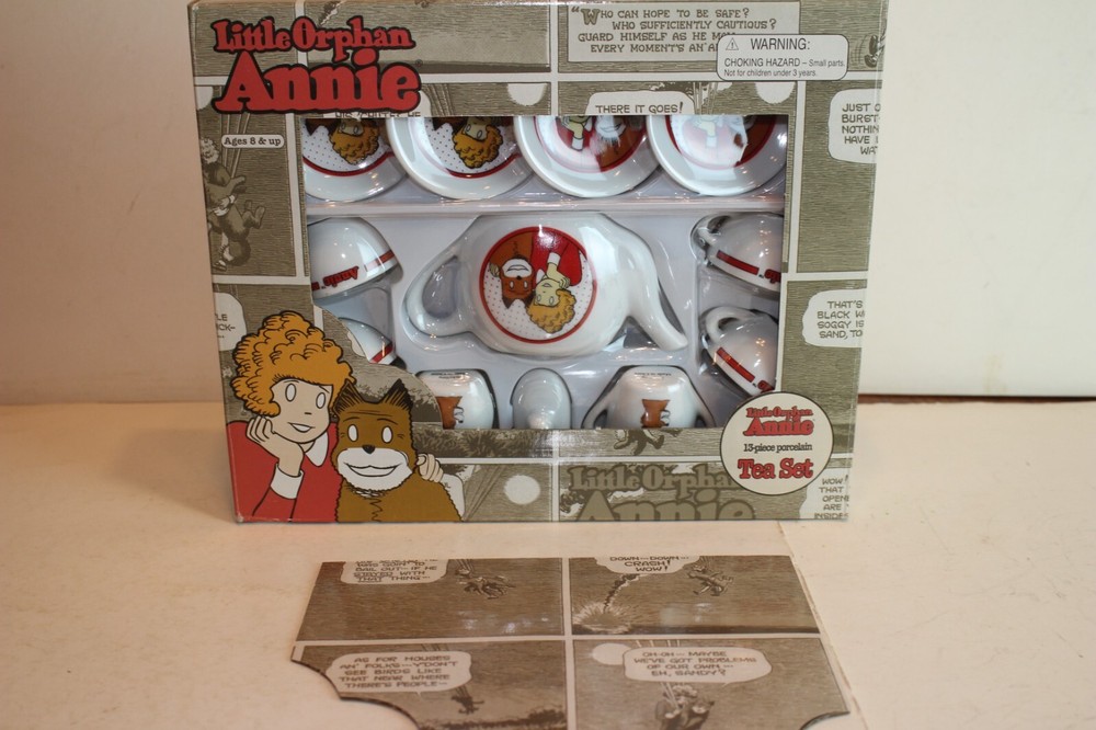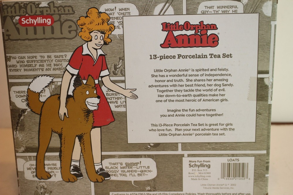 LITTLE ORPHAN ANNIE 13 PIECE PORCELAIN CHILD'S TEA SET BY SCHYLLING. TEA SET IS IN ORIGINAL PACKAGING AND LOOKS BRAND NEW. SEE PICTURES FOR DETAILS.