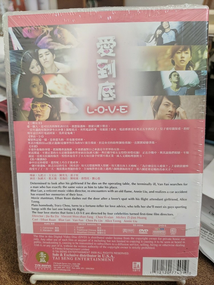 PLEASE READ DESCRIPTION BEFORE YOU BUY DVD Movie Title: L-O-V-E Region 0, or all region, NTSC (USA) Audio: Cantonese/Mandarin Subtitles: English/Chinese on/off Picture: Widescreen Made in: Hong Kong Synopsis: Determined to look after his girlfriend if he dies on the operating table, the terminally ill, Van Fan searches for a man who has exactly the same voice as him to take his place. Blue Lan, a reticent music video director, re encounters with an old flame, Annie Liu, and realizes a car accident has erased her memories of their love. Movie stuntman, Ethan Ruan dashes out the door after a lover's spat with his flight attendant girlfriend, Alice Tzeng. Plain homebody, Tracy Chou, turns to a fortune teller for love advice, who tells her she'll meet six guy sporting bangs with the last one being Mr Right. The four love stories that form L-O-V-E are directed by four celebrities turned first time film directors Comment: -The movie brand new and sealed, distributed by Tai Seng Entertainment. -I need the payment right away after purchasing, I can’t hold the transaction due to my inventory issue. NOTE: I keep doing best efforts to satisfy my customers. If you are satisfied with my product and service, please leave positive feedback, if not, please DO NOT immediately leave negative feedback. I’m responsible for my merchandise. If by any chance a mistake occurs, please communicate your problem to me. I will definitely respond and do my best to solve your problem within 24 hours.