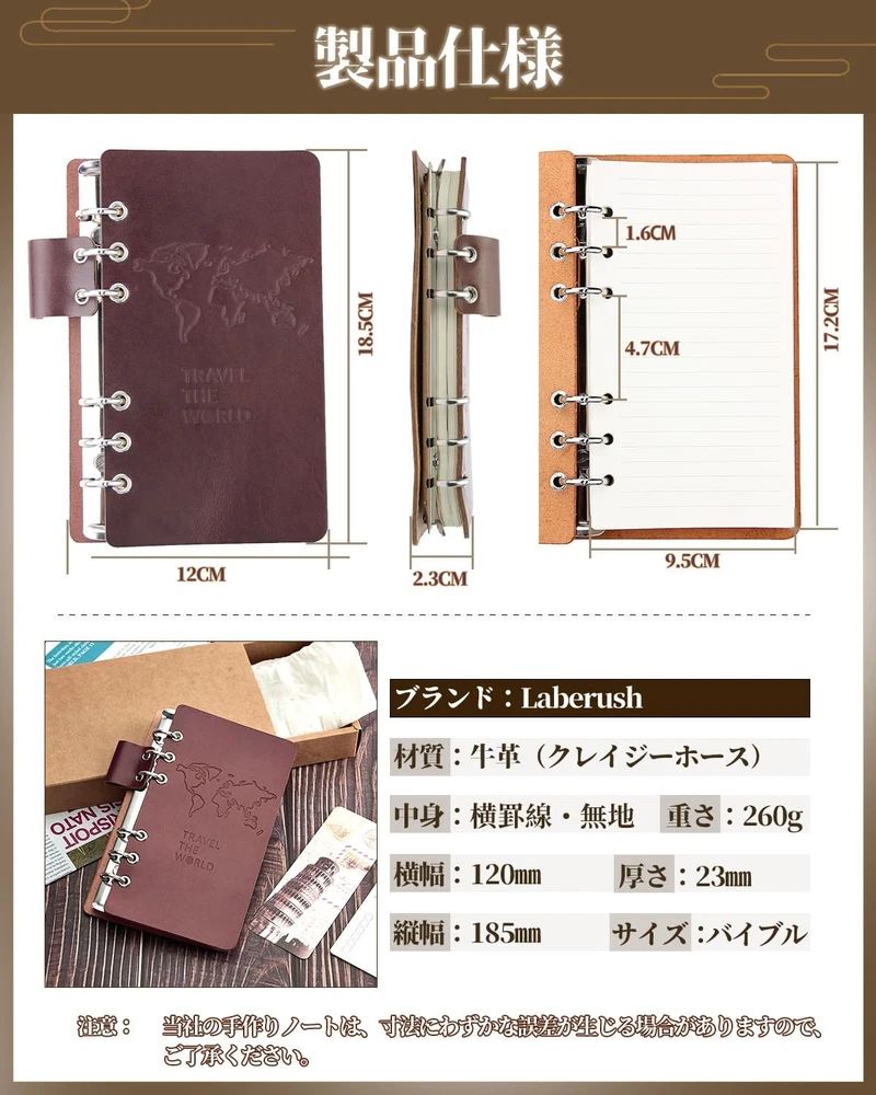 c1dr5rd944 Thank you for visiting our page [Laberush] System Notebook Bible Size Genuine Leather 2025 6 Holes Binder Notebo [ Brand ] :Laberush Detail [ Condition ] New [Natural Leather Charm] Made of 100% high-quality genuine cow leather, the fabric is thick and flexible, has a nice texture, and is wrinkle-resistant and feels good to the touch. The blood lines and wrinkles that are unique to natural leather will become more familiar the more you use it, and the color and luster will increase, creating a tasteful atmosphere. Most of the metal fittings are made of pure copper or alloy metals to ensure long-lasting performance. ■[Easy to carry] The Bible size system notebook (18.5cm x 12cm) is a popular size that is easy to carry in your bag and is suitable for carrying notebooks and stationery. This loose-leaf notebook allows you to freely increase or decrease the number of sheets of paper, making it convenient to use depending on the purpose. You can also use your favorite refill to make it even easier to use. ■ [Good writing comfort] We are particular about the writing quality, and use high-quality paper for a smooth writing experience, and the nib that glides smoothly and feels comfortable and does not easily bleed through. Additionally, the paper has a soft tone, which helps relieve writing fatigue. There are two types of system pages: horizontal ruled lines and plain color, and you can freely choose the one that best suits your purpose. ■ [Multi-purpose high-quality notebook] Widely used as a schedule book, etc., so it is perfect for yourself, as a business gift for co-workers, to celebrate retirement, employment, promotion, as a graduation gift for your child, as a birthday present for your lover or friend, and as a gift for your mother on Mother's Day. There are two color variations, so please choose the one that suits your preference. ■※Also, if there are noticeable scratches or stains on the product, gently wipe it with a soft cloth, Vaseline, or wet tissue to make the scratches and marks invisible. [ Country of Manufacture ] If "Made in Japan" is NOT described on whole listing page, Items are manufactured in other country (China, Vietnam and etc.). [ Manual & Menu Language ] We treat Japanese Market Usage Items. So items have only Japanese Manual & Menu Language. Please contact us if you would like to know more details. *Japanese Menu Only : Panasonic Camera *English Menu available : Nikon, Canon [ Warranty ] Japanese Warranty Only. Buyers need to send item to us in Japan to repair with warranty & own all shipping cost. If you need to repair item in your country with warranty, please do not order this item. [ Electronics ] Japan Usage Item. Voltage:100V, Plug :Type A, FM Tune:70-90MHz Please check your country's condition for use. [ Multiple sizes and colors ] Before your payment, please contact us about stock of size & color. International Buyers [ International Buyers - Please Note ] - Import duties, taxes and charges are not included in the item price or shipping charges. These charges are the buyer's responsibility. - Please check with your country's customs office to determine what these additional costs will be prior to bidding/buying. - These charges are normally collected by the delivering freight (shipping) company or when you pick the item up. Please do not confuse them for additional shipping charges. Shipping [ Shipping Address ] We ship to only address where be registered on eBay. [ Combine shipping & Large Quantity ] Please contact us for combine shipping & large quantity deals before payment. We do our best for you!!!!! [ Li-ion Battery ] Some countries( Germany,France,Italy,Mongolia,SriLanka,Turkey,Nigeria and more.) does not accept lithium battery via EMS, SAL by Post Office. Please check your country's rule yourself. If we receive order from buyer who located in these countries, we will ask buyer to choose 1 from 3. 1. Ship without Ri-ion Battery removed from item. 2. Change shipping method to Fedex or DHL with additional shipping cost. 3. Cancel