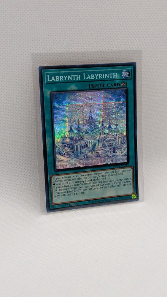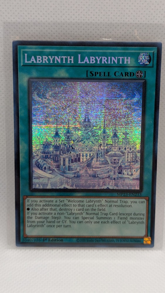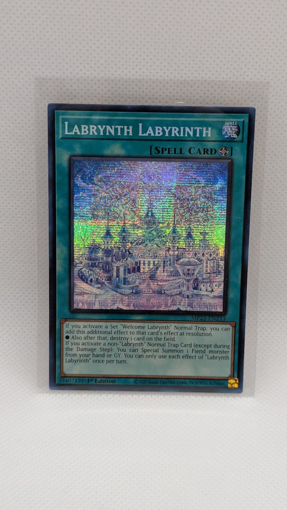 Same Day Shipping, Always Pack Fresh, Always Near Mint. The "Labrynth Labyrinth" card is a Spell-Field card from the 25th Anniversary Tin: Dueling Heroes Mega Pack set in the Yu-Gi-Oh! TCG. It is a Prismatic Secret Rare card with 1st Edition features. The card allows for additional effects when activating specific Normal Trap cards, such as destroying a card on the field or Special Summoning a Fiend monster from the hand or graveyard. Its unique abilities can only be used once per turn, adding strategic depth to gameplay.