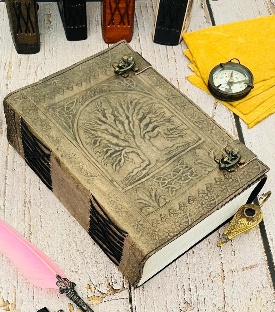 Style - Tree of life leather journal Color - Antique/black/Brown Page - 120 Sheets ( 240 pages counting both Side ) Lock - Brass C-lock Size - 10 x 13 inch / 7 x 10 inch This stunning leather journal is adaptable to use as a memory journal, sketch book, manuscript book etc. This embossing journal is adorned with detailed leather. It is perfect for classic calligraphy and scripting - a true conversation piece. Indulge yourself to write poetry, spill your heart and soul out onto the handmade fiber pages or use as Guest book / Instagram Photo book. Guest book: The blank handmade paper is very unique and perfect for guest/wedding book. Instagram Photo Book: It can also be used to show off your favorite Instagram images in this handmade leather book by using acid-free scrape booking adhesive or double-sided tape. Overall Length: 13 by 10 inches Pages: 200 pages (counting both sides) Paper Type: Handmade paper Cover: Genuine Cow Hide Leather with Leather Metal Closer Design: Detailed Tree of Life Embossed and leather Whether you’re a mom balancing a family with tons of appointments, a business professional who needs to remember details meetings, or you just want to keep your notes and thoughts collected, this Leather Journal comes with all the style, comfort, and versatility you need to be at your best The leather is produced using traditional methods which allows it to retain its character. This means that each journal is unique and comes with its own set of beautiful creases, bumps and marks that develop with age into something truly special. The leather is protected with natural oils to give it a lovely rich finish .