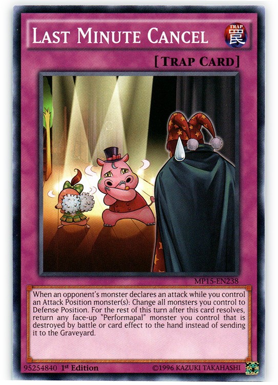 Last Minute Cancel - MP15-EN238 - Common - 1st Edition Image is a stock photo of the card. You will receive the card in Lightly Played condition Condition: Lightly Played ATK/DEF : Ability : Attack #1 : Attack #2 : Attack #3 : Attribute : Trap Card Number : MP15-EN238 Card Rules : Card Text : When an opponent's monster declares an attack while you control an Attack Position monster(s): Change all monsters you control to Defense Position. Until the end of this turn, after this card is activated, return any face-up "Performapal" monster you control that is destroyed by battle or card effect to the hand instead of sending it to the Graveyard. Card Type : Normal Trap Card Edition : 1st Finish : HP : Illustrator : Level : Manufacturer : Monster Type : Name : Last Minute Cancel Passcode : 95254840 Pendulum Scale : Rarity : Common Resistance : Retreat Cost : Set : 2018 Mega Tin Pack Stage : Weakness : Be sure to visit our store for a wide selection of your favorite cards! We are running specials RIGHT NOW!! Shipping Options: ~Ships in a regular white envelope with a stamp for FREE! (THERE IS NO TRACKING INFORMATION AVAILABLE FOR THE ABOVE METHOD. SHIPPING TIME IS 4-10 BUSINESS DAYS) ~Ships in a TRACKEDbubble mailer for $5.99! ~Shipments are handled same or next business day. ~FREE SHIPPING for each additional card, so shop around our store!