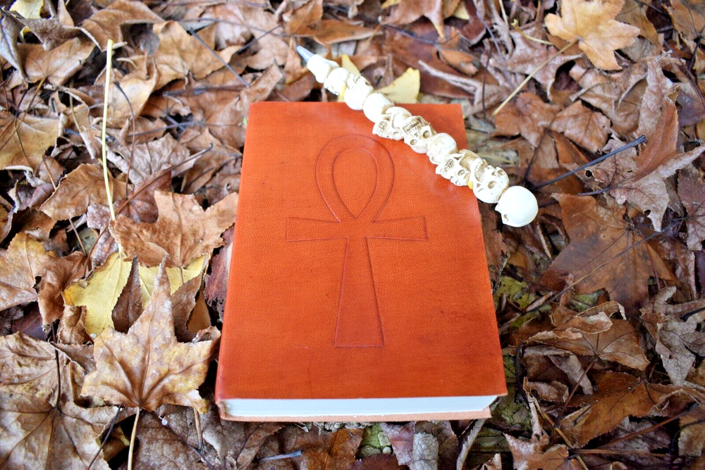 Leather Bound BOOK OF SHADOWS Ankh Notebook, Grimoire, Journal or Diary Unlock the mysteries with our leather-bound notebook featuring an ankh embossed on the front. Made with recycled handmade unlined paper pages, this notebook is perfect for recording your spiritual musings and magical workings. The leather cover not only adds a touch of elegance but also ensures that your notes will be protected for years to come. Whether you're a witch, wizard, or mystic, this notebook will be a valuable tool in your spiritual journey. Your Grimoire Details Size of Grimoire Height: 17cm ( 6 ¾") Width: 12cm (5 ¾") Depth: 3cm (1 ¼") Contains: 1 Leather-bound Grimoire