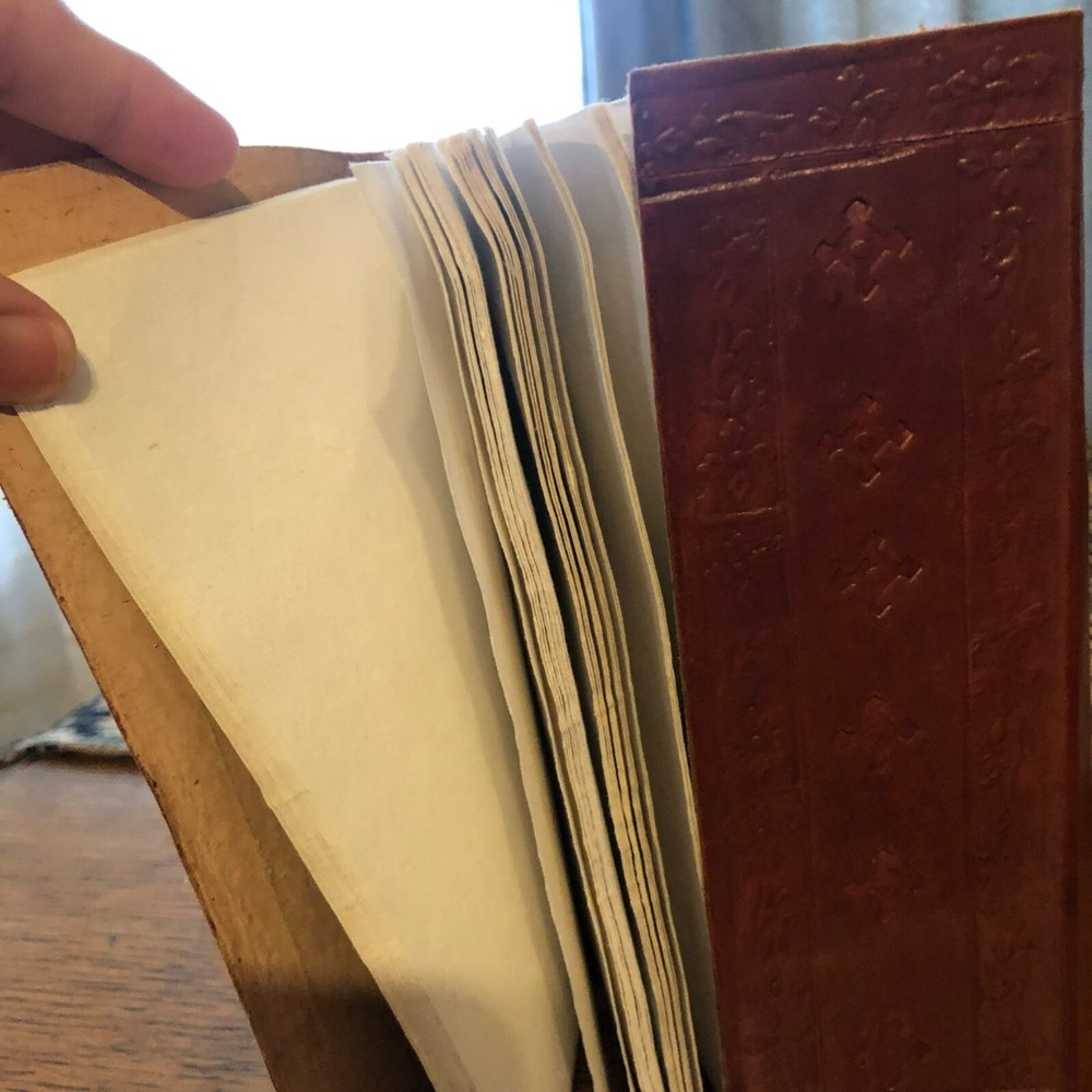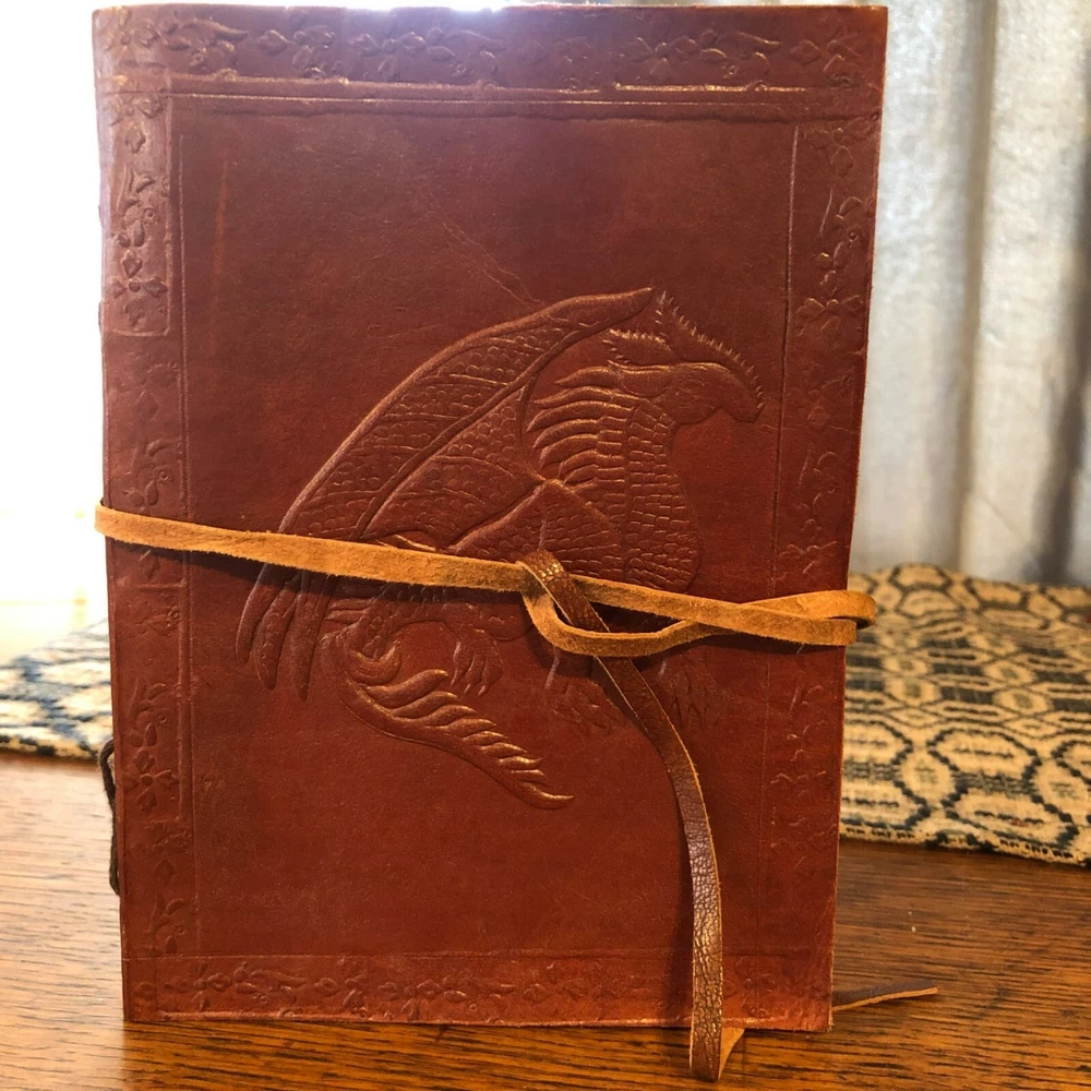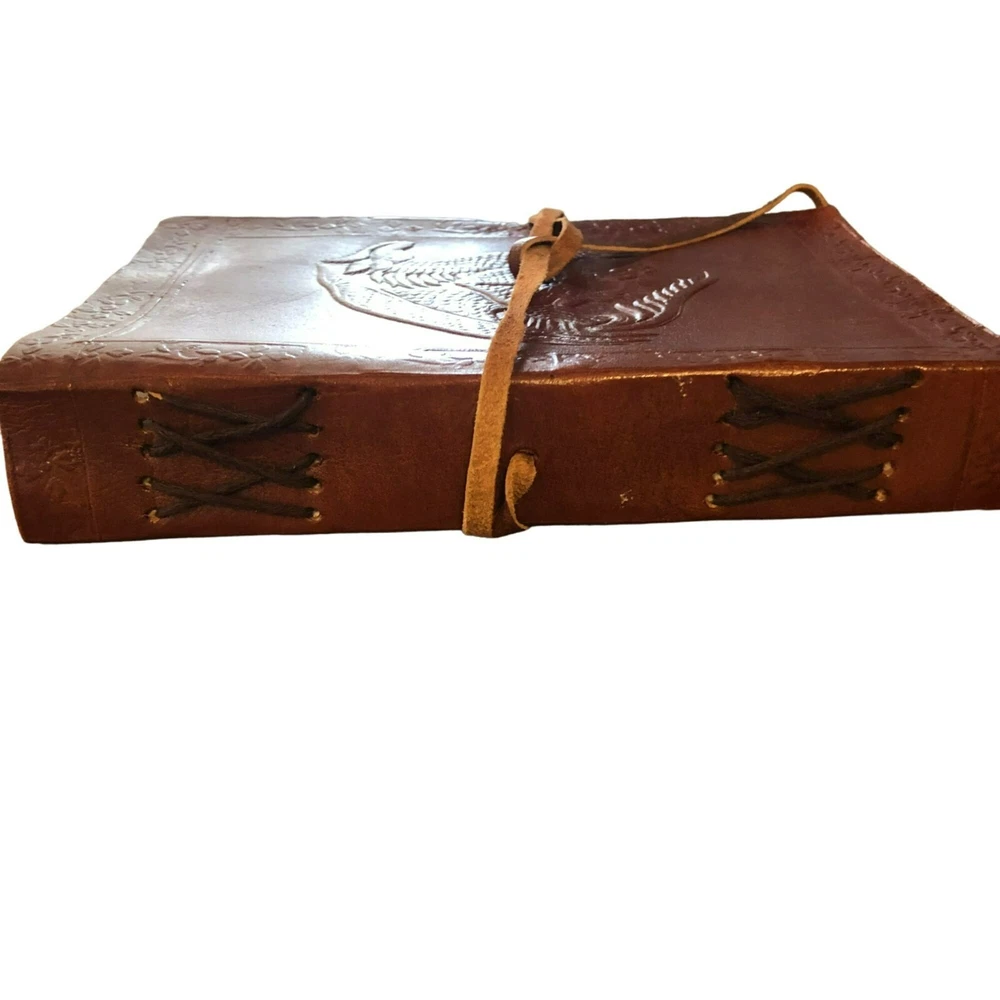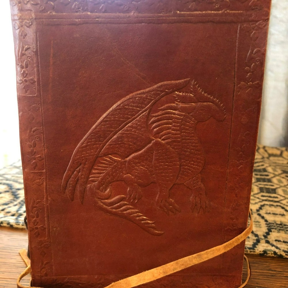 Crafted to perfection, this leather-bound, handmade journal features an embossed dragon on the cover. Made from pulp, it's ideal for keeping records, sketching, or journaling. • Leather-bound cover for durability • Handmade for a unique touch • Embossed dragon design for a stylish look • Pulp pages offer a smooth writing surface Size: 7"x5"x1" Condition: New Without Tags Handmade unbranded