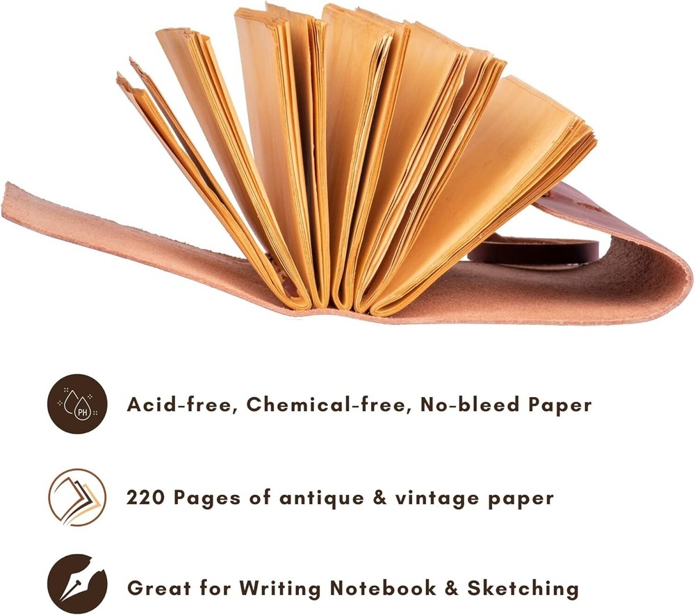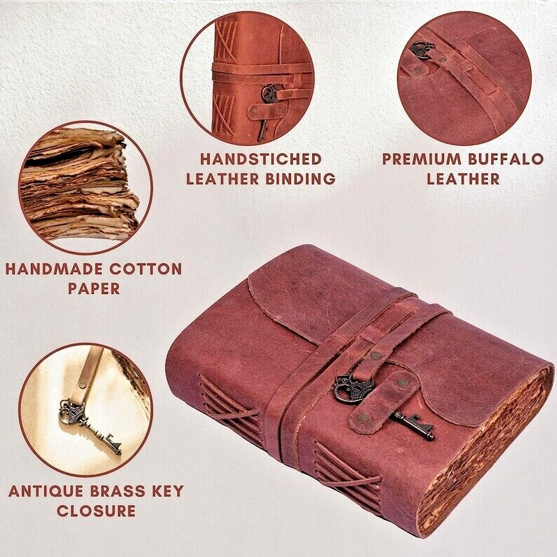 If you're looking for a quality leather journal crafted to last or a perfect gift for that special someone, you've hit the jackpot! Every journal we make is custom made to order and crafted with genuine full grain leather our exquisite Leather Journal Diaries with Deckle Edge Vintage Paper and complete with stunning designs on the cover Each diary is expertly handcrafted using high-quality leather, ensuring durability and longevity. Shree Handcrafts journals feature deckle edge vintage paper. ✦ Manufacturer : Swati Art & Design ✦ Leather – Best Quality Genuine Leather ✦ Soft Natural Handmade Leather Cover ✦ Bronze lock closure ✦ Color – Wine (Blackberry) ✦ Paper - Handmade Vintage/Antique Deckle Edge Paper ✦ Size - 7 x 5 Inches ✦ Pages - 200 Pages both side ✦ Material -- Leather Cover, Handmade Vintage Plain Paper, leather strap lock closer ✦Care Instructions: Wipe clean with a dry cloth. ✦ Antique Paper - Vintage Journal is made of unique vintage paper which looks like it was pulled from history. You will love the old looking handmade cotton paper. which is unique to our vintage journals. ✦ Sturdy Binding, Leather Wraparound And Key - Sturdy hand stitched binding to make sure that no paper comes out loose. The leather wraparound with a cute key that slips in will make sure that the papers inside the journal are safe and secure. ✦ Sketchbook is great for keeping by the bedside to jot down dreams, or for use as a diary or journal. ✦ It is a truly unique and wonderful gift for a friend, the men, women, and wiccans in your life! or to treat yourself to as a special keepsake ✦ our journals are influenced by symbolism that is derived from the Wicca/Pagan community, creating a personalized space where your inner creative genius can flourish. ✦ The paper is made from sustainable cotton and jute canvas. The paper is acid-free and pH neutral therefore is a timeless piece of art. ✦ Use Any Kind Of Pen - Sketch, Doodle, Write on your journal notebook with a Calligraphy Pen Fountain Pen, Brush Pen, Ball Pen, Acrylic Colors, Watercolor and many more. ✦ Shipping Policy :- Orders will be dispatched from our location in India within one to Two working day once the payment is cleared. Although, we make every effort to ship the items within one day. # Free Shipping for all world and fast shipping # FAST SHIPPING-I WILL SHIP NEXT WORKING DAY BY ( USPS ,DHL EXPRESS AND INDIA POST ) ✦Approximate delivery time for economy service :- ✦ UK, USA & Singapore : 8 - 15 days ✦ Europe : 10 - 20 days ✦ Rest of World : 15 - 30 days ✦ Timelines mentioned are working days based on the recent feedback from our buyers and not guaranteed. Delivery times vary during peak periods