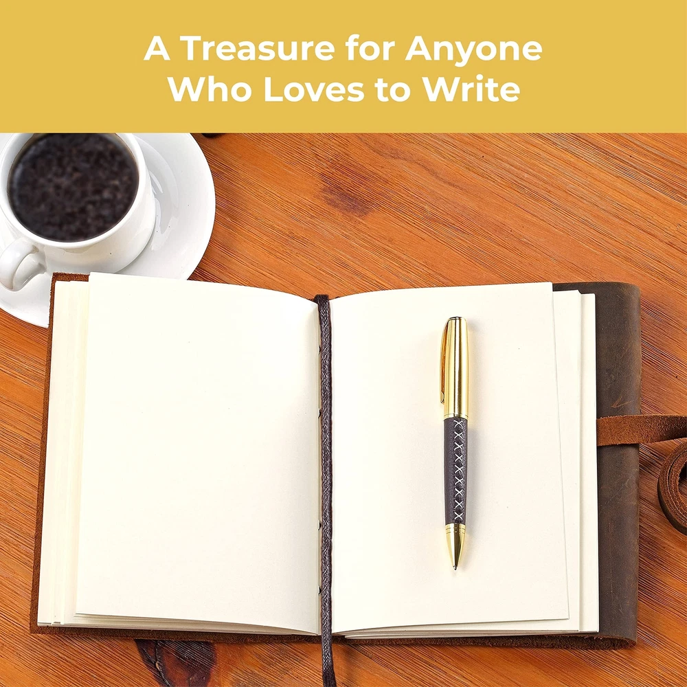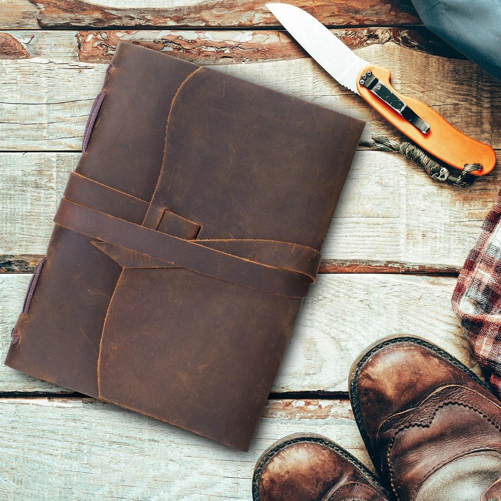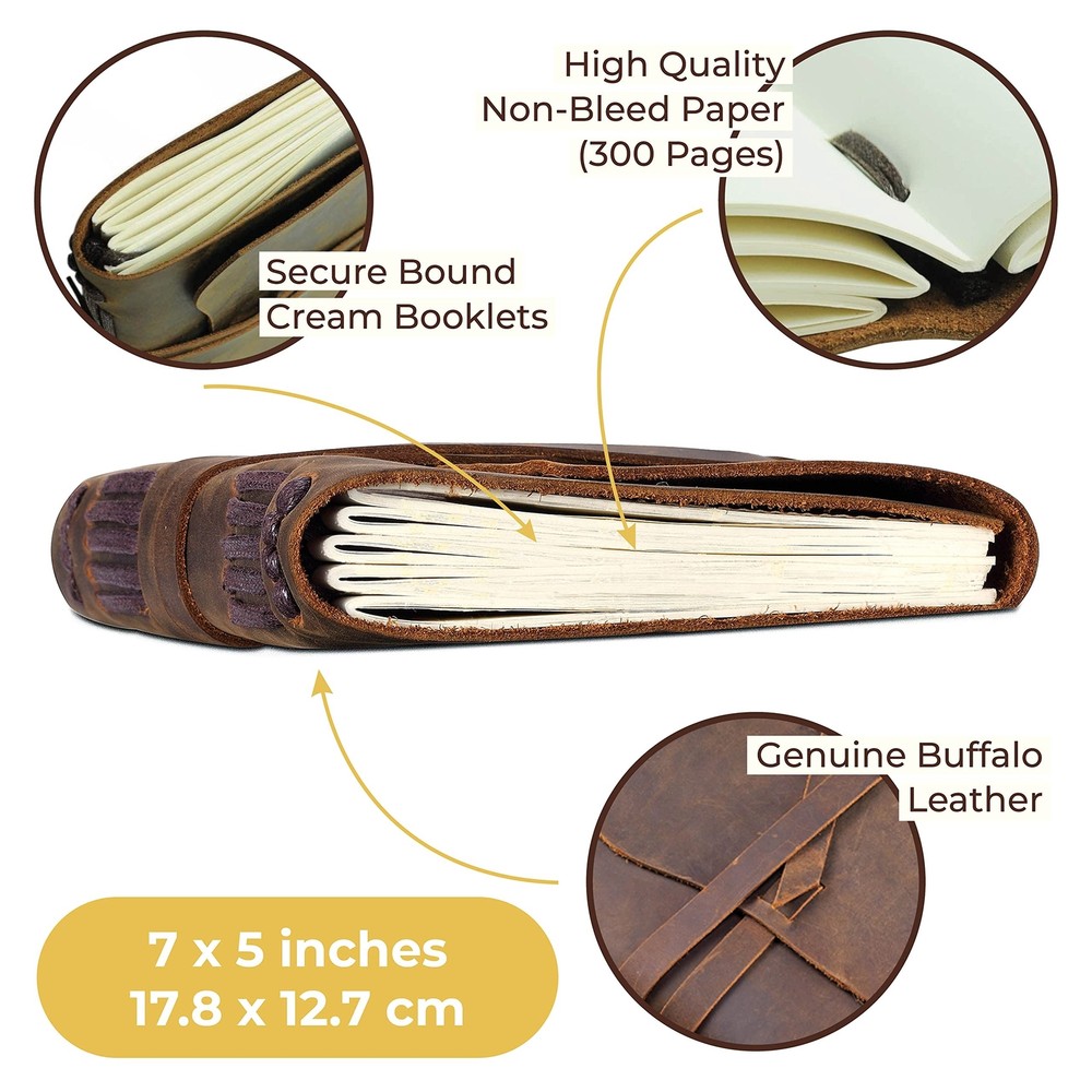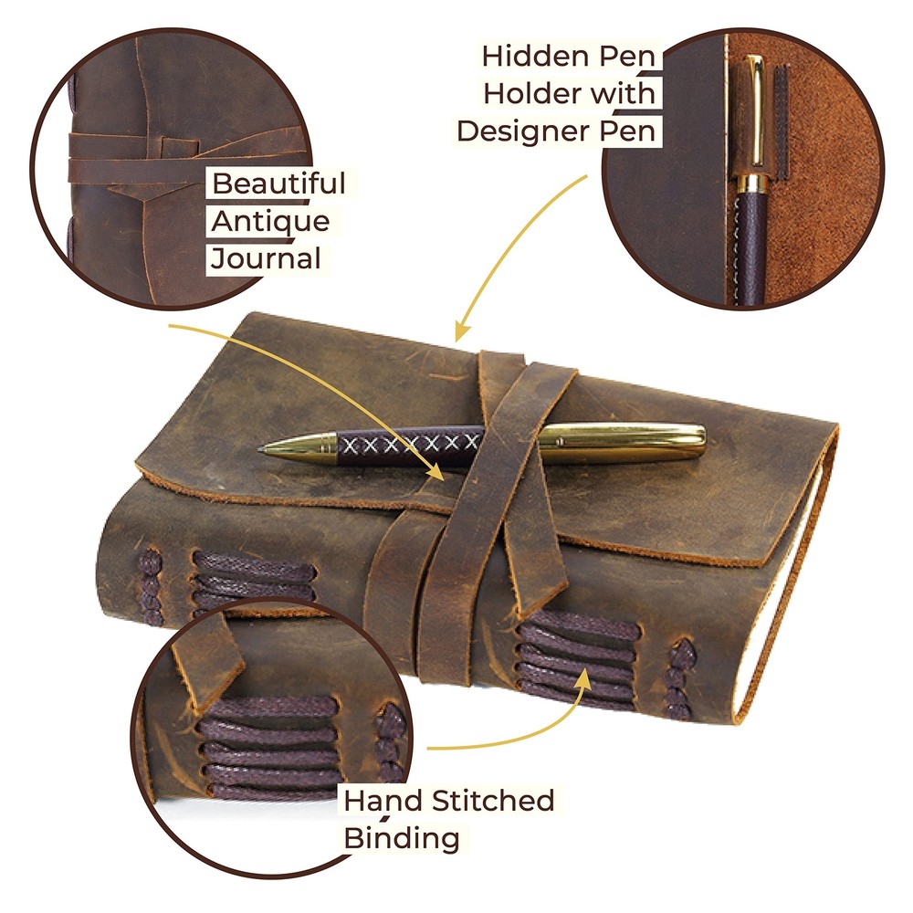 Leather Bound Journal for Men and Women, Handmade Gift Set with Antique Journal and Stylish Pen, Vintage and Classic, Notebook, Sketchbook, Planner and Diary (300 Pages) (7x5") ✓ Free 60 Day Returns ✓ Free Express Shipping Description: Features: UNIQUE GIFT SET: Handmade leather journal with beautiful front soft cover with matching designer pen, hidden pen holder and jute bookmark. Presented in an eco-friendly recycled box. A timeless gift for someone special who loves to write. PREMIUM LEATHER: Crafted with delicate yet super tough buffalo leather, including a long strap that secures the journal firmly. Our genuine leather is thicker than competitors and offers lifetime durability with lasting softness. RUSTIC DESIGN: Achieves a unique and distressed look when scratched and features decorative stitching for added charm. Coated with special natural oils that make handling a joy. Plus, it has a wonderful authentic leather smell that inspires you to write daily. QUALITY CREAM PAPER: 300 premium unlined multipurpose sheets for notes, daily plans, sketches, inspiring ideas, memories and more. Zero bleed through with fountain pens. Not refillable. PERFECT SIZE: 7x5" made to suit a wide range of writing styles. We also offer many other sizes and styles of journals, including refillable journals. There's something for everyone! Product Details: Brand: Sovereign-Gear Color: Antique Brown Theme: Book Cover Material: Leather Style: Vintage Ruling Type: Plain Special Feature: Soft cover Number of Items: 1 Binding: Unknown Binding Manufacturer: Sovereign-Gear Manufacturer: Sovereign-Gear Brand: Sovereign-Gear Item Weight: 1.07 pounds Product Dimensions: 7.87 x 6.14 x 1.65 inches Item model number: SG-AJ Is Discontinued By Manufacturer: No Color: Antique Brown Cover Material: Leather Number of Items: 1 Size: 7" x 5" Ruling: Plain Manufacturer Part Number: SG-AJ Date First Available: September 27, 2016