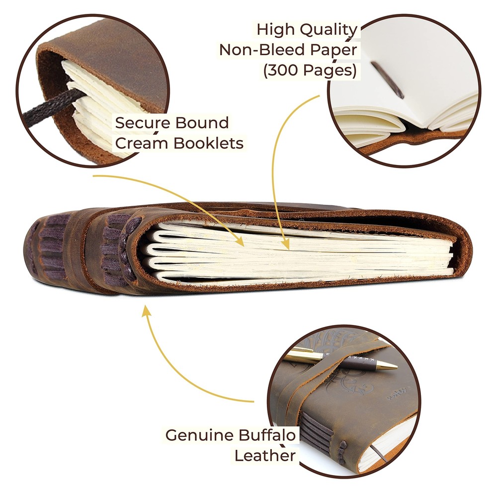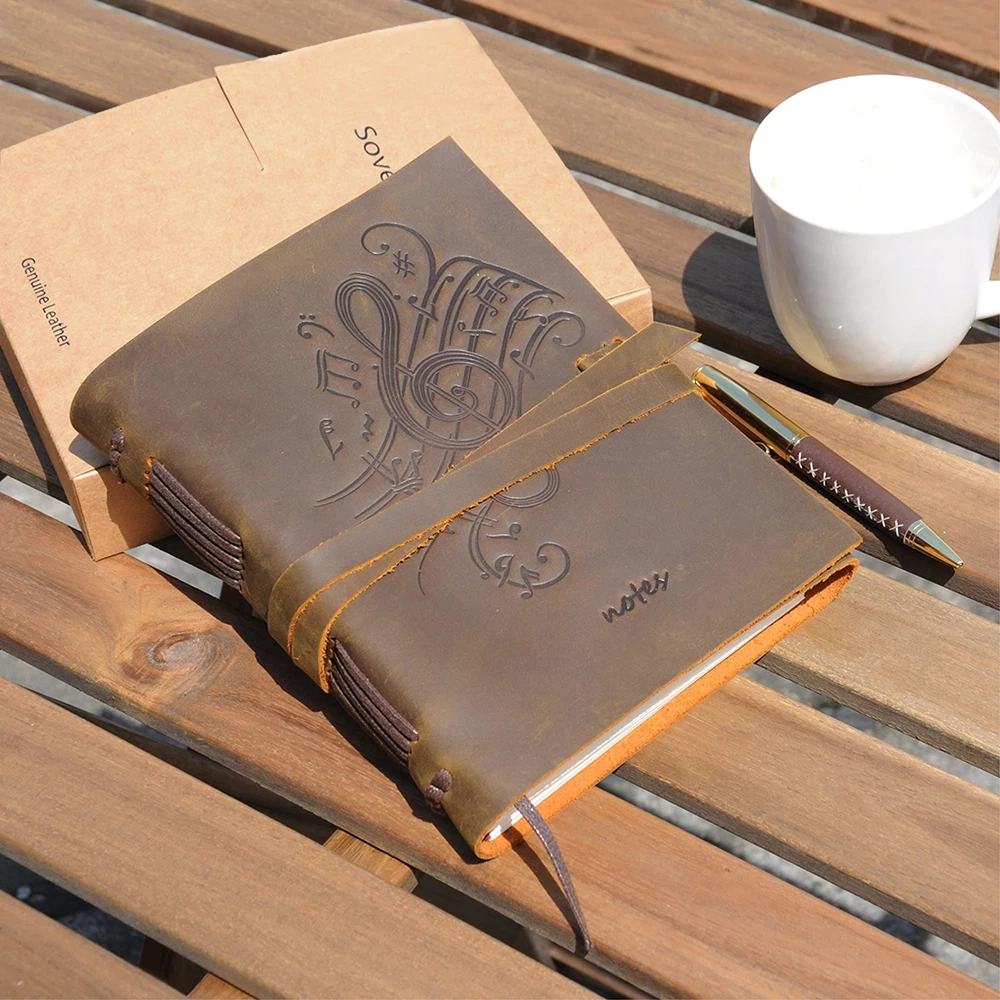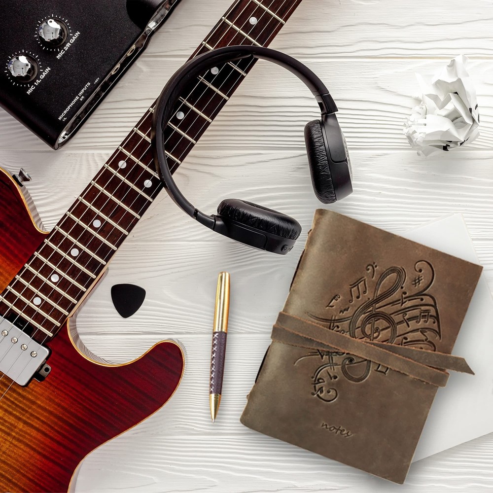 Leather Bound Journal for Men and Women, Handmade Gift Set with Music Notes Embossed Journal and Stylish Pen, Vintage and Classic, Notebook, Sketchbook, Planner and Diary (300 Pages) (8x6") ✓ Free 60 Day Returns ✓ Free Express Shipping Description: Features: UNIQUE GIFT SET: Handmade leather journal with beautiful Music Notes embossed front soft cover with matching bookmark, designer pen and hidden pen holder. Presented in an eco-friendly recycled box. A timeless gift for that special someone who loves to write. PREMIUM LEATHER: Crafted with delicate yet super tough buffalo leather, including a long strap that secures the journal firmly. Our genuine leather is thicker than competitors and offers lifetime durability with lasting softness. RUSTIC DESIGN: Achieves a unique and distressed look when scratched and features decorative stitching for added charm. Coated with special natural oils that make handling a joy. Plus, it has a wonderful authentic leather smell that inspires you to write daily. QUALITY CREAM PAPER: 300 premium unlined multipurpose sheets for notes, daily plans, sketches, inspiring ideas, memories and more. Zero bleed through with fountain pens. Not refillable. PERFECT SIZE: 8x6" made to suit a wide range of writing styles. A percentage of our profits go to Afrinspire - a not-for-profit organization that helps educate and provide local facilities to African communities. Product Details: Brand: Sovereign-Gear Color: Antique Brown Theme: Music Sheet Size: A5 Pages: 300 Cover Material: Leather Style: Music Ruling Type: Ruled Special Feature: technical drawing, sketching, doodling, to-do or shopping lists, puzzles, diagrams, plans, maps, notebooks for men rock and roll journal for men, tune opera jazz soul music melody writing notebook, dad grandad medieval man woman girl grandmother grandma, field notes, task list, memo book, art, goals, pop star, journaling, letters, planning, reminders, travel notes, creative writing composition, diary entries, men, women, seniors, unisex children, travel, journeys, holidays, indoor outdoor, business gifts, musician music lover record music upload music, writers, poets, journalists, journalers, scribes See more Product Dimensions: 8"L x 6"W x 0.15"Th Manufacturer: Sovereign-Gear Brand: Sovereign-Gear Item Weight: 1.45 pounds Product Dimensions: 8.46 x 6.69 x 1.97 inches Item model number: SG-Music-Journal-8x6UK Is Discontinued By Manufacturer: No Color: Antique Brown Cover Material: Leather Material Type: genuine leather, real leather and high quality thick paper Number of Items: 1 Size: 8 inches X 6 inches Ruling: Ruled Sheet Size: A5 Manufacturer Part Number: SG-Music-Journal-8x6 Date First Available: March 26, 2020