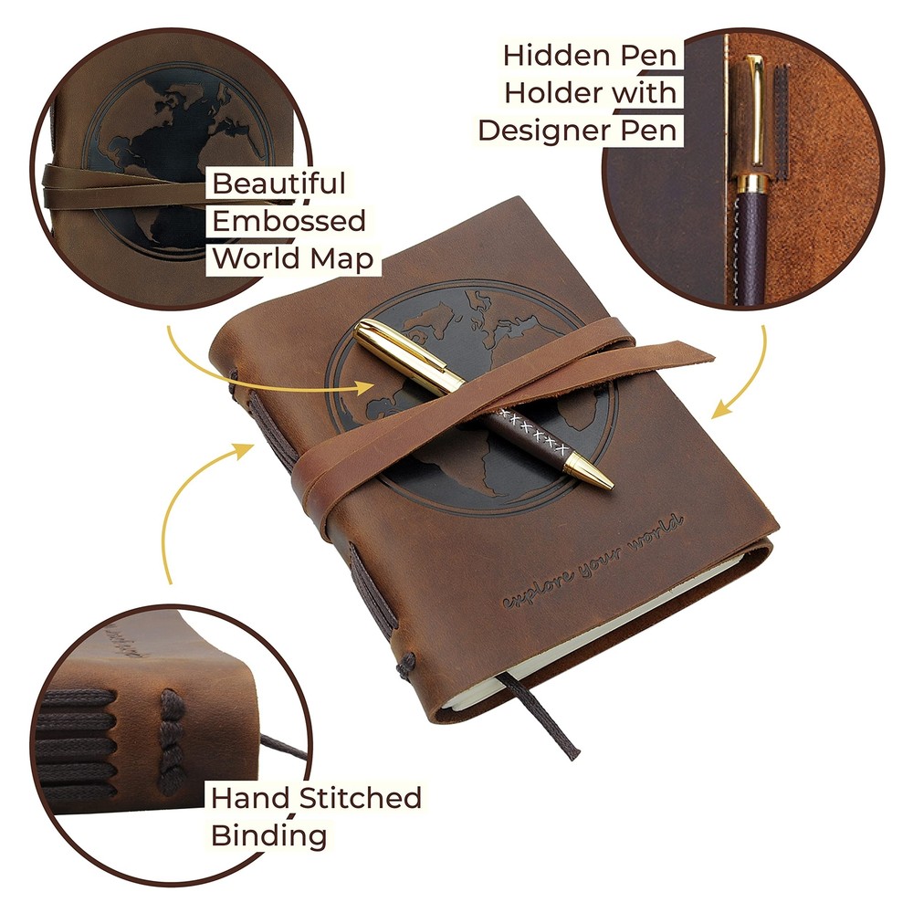 Leather Bound Journal for Men and Women, Handmade Gift Set with World Map Embossed Journal and Stylish Pen, Vintage and Classic, Notebook, Sketchbook, Planner and Diary (300 Pages) (8x6") ✓ Free 60 Day Returns ✓ Free Express Shipping Description: Features: UNIQUE GIFT SET: Handmade leather journal with beautiful World Map embossed front soft cover with matching bookmark, designer pen and hidden pen holder. Presented in an eco-friendly recycled box. A timeless gift for that special someone who loves to write. PREMIUM LEATHER: Crafted with delicate yet super tough buffalo leather, including a long strap that secures the journal firmly. Our genuine leather is thicker than competitors and offers lifetime durability with lasting softness. RUSTIC DESIGN: Achieves a unique and distressed look when scratched and features decorative stitching for added charm. Coated with special natural oils that make handling a joy. Plus, it has a wonderful authentic leather smell that inspires you to write daily. QUALITY CREAM PAPER: 300 premium unlined multipurpose sheets for notes, daily plans, sketches, inspiring ideas, memories and more. Zero bleed through with fountain pens. Not refillable. PERFECT SIZE: 8x6" made to suit a wide range of writing styles. We also offer many other sizes and styles of journals, including refillable journals. There's something for everyone! Product Details: Brand: Sovereign-Gear Color: Antique Brown Theme: Book Sheet Size: A5 Cover Material: Leather Style: Vintage Ruling Type: Plain Special Feature: Pen Holder Number of Items: 1 Recycled Content Percentage: 10 Manufacturer: Sovereign-Gear Brand: Sovereign-Gear Item Weight: 1.4 pounds Product Dimensions: 8.46 x 6.69 x 1.97 inches Item model number: SG-Map-Journal-8x6 Is Discontinued By Manufacturer: No Color: Antique Brown Cover Material: Leather Material Type: Leather Total Recycled Content Percentage: 10 Number of Items: 1 Ruling: Plain Sheet Size: A5 Manufacturer Part Number: SG-WMap-Journal-8x6 Date First Available: June 19, 2018