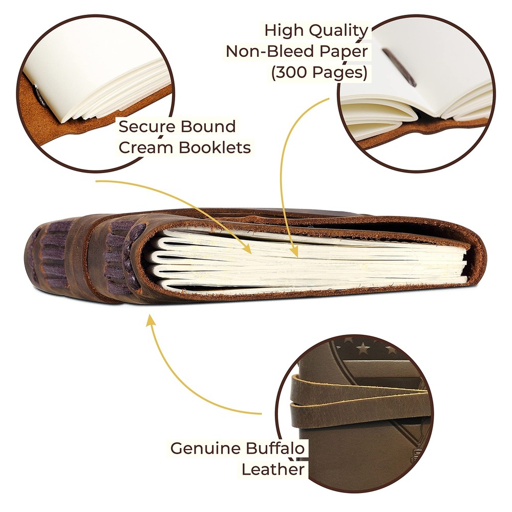 Leather Bound Journal for Men and Women, Handmade Patriotic Gift Set with Love USA Heart Flag Embossed Journal and Stylish Pen, Vintage Notebook, Sketchbook, Planner and Diary (300 Pages) (8x6") Product Details Size: 8" x 6" Style: USA Heart Flag Brand: Sovereign-Gear MPN: SG-US_Flag-Journal-8x6 EAN: 5060505401455 UPC: Does not apply Brand: Sovereign-Gear Color: Brown Theme: Book Sheet Size: A5 Pages: 300 Pages Cover Material: Leather Style: USA Heart Flag Ruling Type: Plain Special Feature: Pen Holder Number of Items: 1 Manufacturer: Sovereign-Gear Brand: Sovereign-Gear Item Weight: 1.5 pounds Product Dimensions: 6.69 x 1.97 x 8.46 inches Color: Brown Cover Material: Leather Material Type: Leather Number of Items: 1 Size: 8" x 6" Ruling: Plain Sheet Size: A5 Manufacturer Part Number: SG-US_Flag-Journal-8x6 Date First Available: June 20, 2022 UNIQUE GIFT SET: Handmade leather journal with beautiful USA Heart flag embossed front soft cover with matching bookmark, designer pen and hidden pen holder. Presented in an eco-friendly recycled box. A timeless gift for that patriotic someone who loves to write. PREMIUM LEATHER: Crafted with delicate yet super tough buffalo leather, including a long strap that secures the journal firmly. Our genuine leather is thicker than competitors and offers lifetime durability with lasting softness. RUSTIC DESIGN: Achieves a unique and distressed look when scratched and features decorative stitching for added charm. Coated with special natural oils that make handling a joy. Plus, it has a wonderful authentic leather smell that inspires you to write daily. QUALITY CREAM PAPER: 300 premium unlined multipurpose sheets for notes, daily plans, sketches, inspiring ideas, memories and more. Zero bleed through with fountain pens. Not refillable. PERFECT SIZE: 8x6" made to suit a wide range of writing styles. We also offer many other sizes and styles of journals, including refillable journals. There's something for everyone!