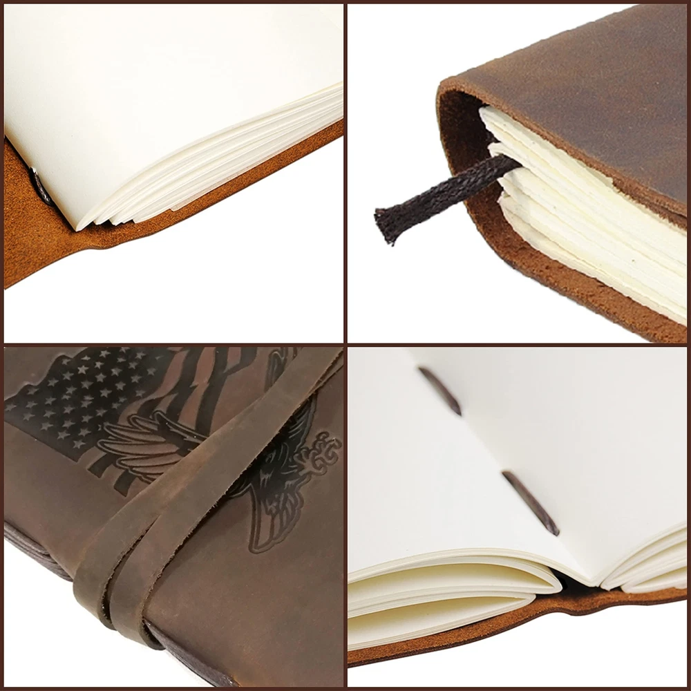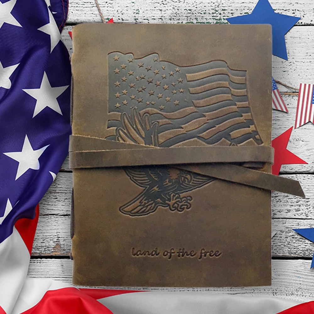 Leather Bound Journal for Men and Women, Handmade Patriotic Gift Set with USA Flag and Eagle Embossed Journal and Stylish Pen, Vintage Notebook, Sketchbook, Planner and Diary A5 (300 Pages) (7x5") ✓ Free 60 Day Returns ✓ Free Express Shipping Description: Features: UNIQUE GIFT SET: Handmade leather journal with beautiful USA flag and Eagle embossed front soft cover with matching bookmark, designer pen and hidden pen holder. Presented in an eco-friendly recycled box. A timeless gift for that patriotic someone who loves to write. PREMIUM LEATHER: Crafted with delicate yet super tough buffalo leather, including a long strap that secures the journal firmly. Our genuine leather is thicker than competitors and offers lifetime durability with lasting softness. RUSTIC DESIGN: Achieves a unique and distressed look when scratched and features decorative stitching for added charm. Coated with special natural oils that make handling a joy. Plus, it has a wonderful authentic leather smell that inspires you to write daily. QUALITY CREAM PAPER: 300 premium unlined multipurpose sheets for notes, daily plans, sketches, inspiring ideas, memories and more. Zero bleed through with fountain pens. Not refillable. PERFECT SIZE: Designed with a choice of two sizes - 7x5" or 8x6" to suit a wide range of writing styles. We also offer many other sizes and styles of journals, including refillable journals. There's something for everyone! Product Details: Brand: Sovereign-Gear Color: Brown Theme: Book Sheet Size: A5 Pages: 300 Cover Material: Leather Style: USA Flag Ruling Type: Plain Special Feature: Soft cover Number of Items: 1 Manufacturer: Sovereign-Gear Brand: Sovereign-Gear Item Weight: 1.18 pounds Product Dimensions: 6.69 x 1.97 x 8.46 inches Color: Brown Cover Material: Leather Material Type: Leather Number of Items: 1 Size: 7" x 5" Ruling: Plain Sheet Size: A5 Manufacturer Part Number: SG-US_Flag-Journal-8x6 Date First Available: December 19, 2021