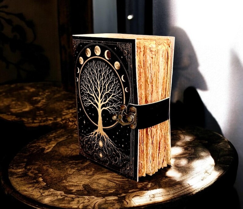Large Grimoire leather journal, Print Tree of Life Journal, Blank spell book book of shadows Leather Celestial Gifts For Him Her • Print - Tree of life • Vintage lock closure • Genuine buffalo leather • Vintage deckle edge old paper • handmade rustic cotton paper • 100 Sheet (200 pages both side) • 200 Sheet (400 pages both side) ▶ Size - 7x5 Inches, 8x6 Inches, 10x7 Inches ● Leather journal witchcraft book of shadows notebook is made with Antique Paper which looks like it was pulled from history. You will fall in love with the antique handmade cotton paper which is unique to our Vintage Journal Notebook. ● The vintage clasp lock will keep all your valuable writing locked inside. Study hand stitched binding to make sure that no paper comes out loose from your spell notebook. ● Sketch, Doodle, Write on your Leather Blank Spell Journal with a Calligraphy Pen Fountain Pen, Brush Pen, Ball Pen, Acrylic Colors, Watercolor and many more. We guarantee no bleed through. Personal Diary with Lock, Astrology Journal, Wiccan Spell Book, Mystic Writing Book, Grimoire Notebook, Handmade Diary, Leather Bound Notebook, Gift for Writers, man and woman.