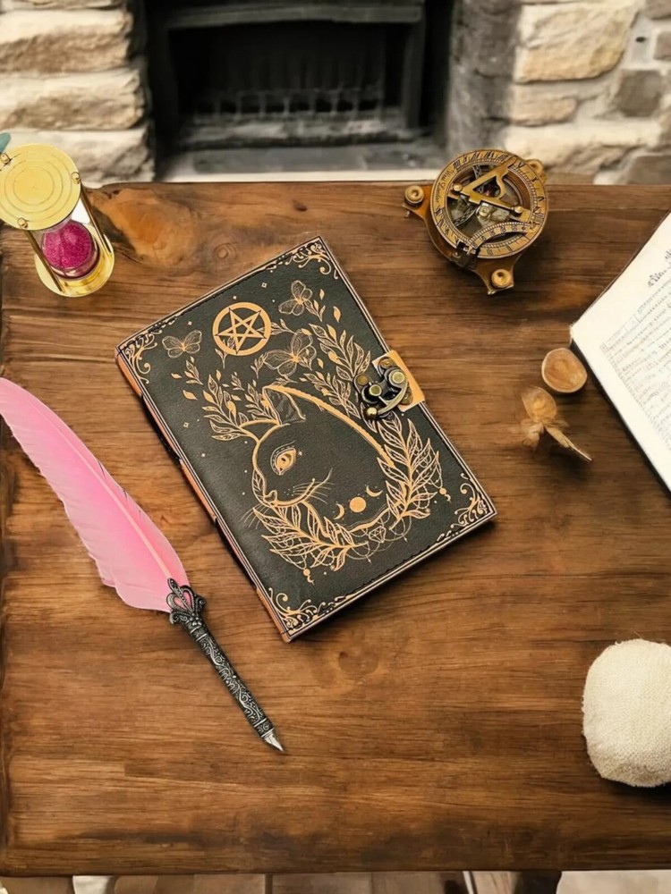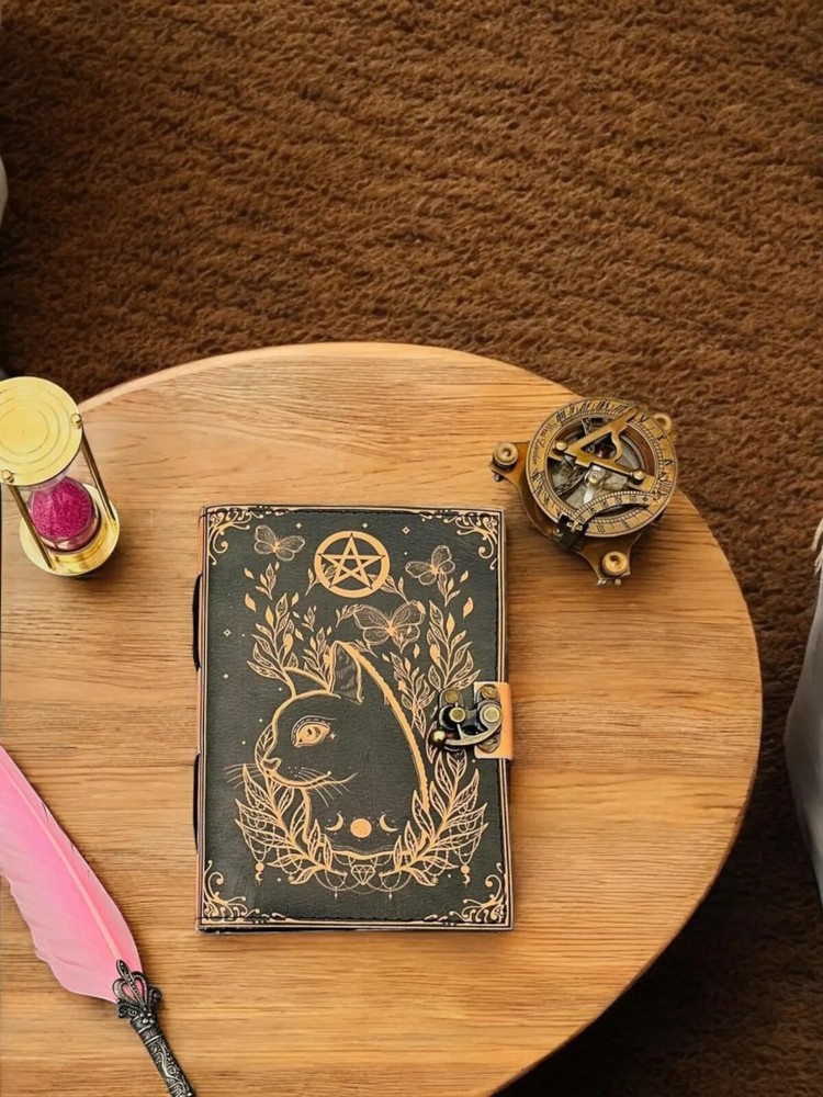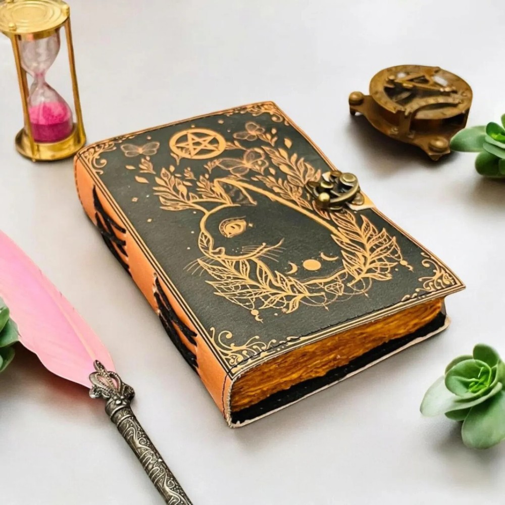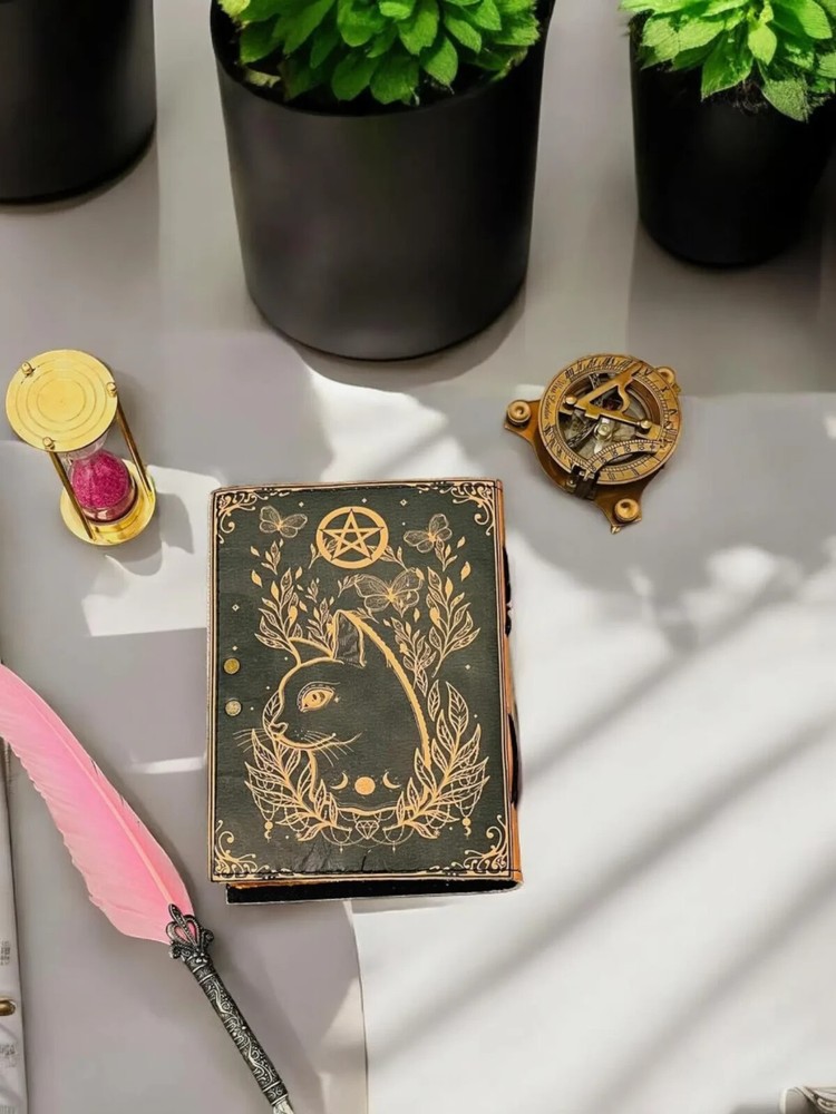 The Leather Cat journal Grimoire Journal Book of shadows Blank spell book Sketchbook is a luxurious and limited edition journal perfect for those seeking a magical and mysterious writing experience. Made with high-quality leather covers, this journal exudes elegance and sophistication. Whether you are a collector or a seeker of occult knowledge, this journal is sure to provide you with a unique and enchanting space to record your thoughts, ideas, and secrets. With its origins in India, this journal brings a touch of exotic allure to your writing practice. Size - 7×5 inches,8 x 6 inches, 10x7inches, 13x10 inches • Color - • C-Lock • genuine leather • vintage deckle edge old paper • 100 Sheet (200 pages both side) ● Antique Paper - Vintage journal is made of unique vintage paper which looks like it was pulled from history. You will love the old looking handmade cotton paper (200 pages) which is unique to our vintage journals. ● VINTAGE LOCK AND STURDY BINDING - The vintage lock will keep all your valuable writing locked inside.Sturdy hand stitched binding to make sure that no paper comes out loose from your vintage notebook. ● sketchbook is great for keeping by the bedside to jot down dreams, or for use as a diary or journal. ● It is a truly unique and wonderful gift for a friend, the men, women, and wiccans in your life! or to treat yourself to as a special keepsake ● our journals are influenced by symbolism that is derived from the Wicca/Pagan community, creating a personalized space where your inner creative genius can flourish. ● The paper is made from sustainable cotton and jute canvas. The paper is acid-free and pH neutral therefore is a timeless piece of art. ● Use Any Kind Of Pen - Sketch, Doodle, Write on your journal notebook with a Calligraphy Pen Fountain Pen, Brush Pen, Ball Pen, Acrylic Colours, Watercolor and many more.