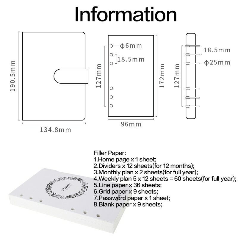 Leather Cover Binder Spiral Notebooks and Journal A6 Personal Planner Organizer Cover size:134.8 x 190.5mm Refill size:96 x 127mm Ring size:25mm Refill paper include: 1.Home page x 1 sheet; 2.Dividers x 12 sheets(for 12 months); 3.Monthly plan x 2 sheets(for full year); 4.Weekly plan 5 x 12 sheets = 60 sheets(for full year); 5.Line paper x 36 sheets; 6.Grid paper x 9 sheets; 7.Password paper x 1 sheet; 8.Blank paper x 9 sheets; Totally 130 sheets(260 pages).