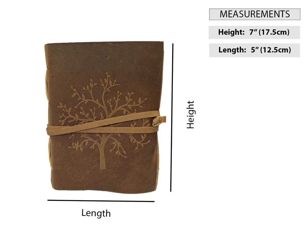 Welcome To DC_Elements TM (Brand: Madosh-Mad Over Shopping) Step into a world where timeless elegance meets unparalleled artistry with our handcrafted Tree Embossed Vintage Brown Leather Journal. This exquisite diary is more than just a notebook; it's a sanctuary for your thoughts, dreams, and aspirations. It is compact sized so you can write wherever you are and can easily fit into a purse or backpack, can carry to your next vacation trip. Designed to stand out from the crowd. Hand cut asymmetric flap and cover with handmade paper. The leather wrap around strap effectively keeps your journal closed and also acts as a handy bookmark. This old-fashioned leather has an amazing smell! Write your experience and capture your thoughts in a journal that transcends time. Order your Tree Embossed Vintage Brown Leather Journal today and make your mark in style. Size: Height: 7" (17.5 cm) | Length: 5" (12.5 cm). Features: Genuine leather Tree of life embossed Clasp closure 100 sheets (200 pages) Country of origin: India Note: 100% Genuine leather diary. It is handmade and made by professional artisans. Paper used in diary are 100% recycled cotton acid free paper. This makes it environment friendly, as this saves trees.