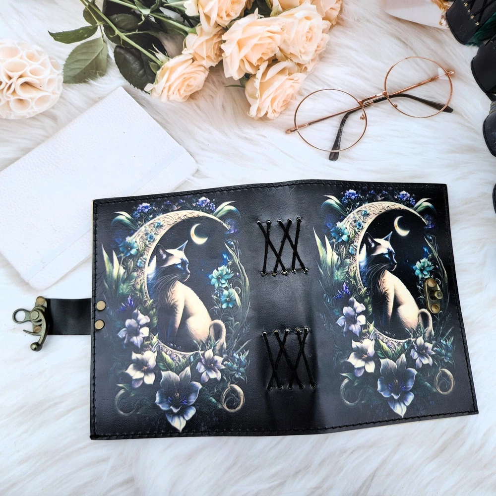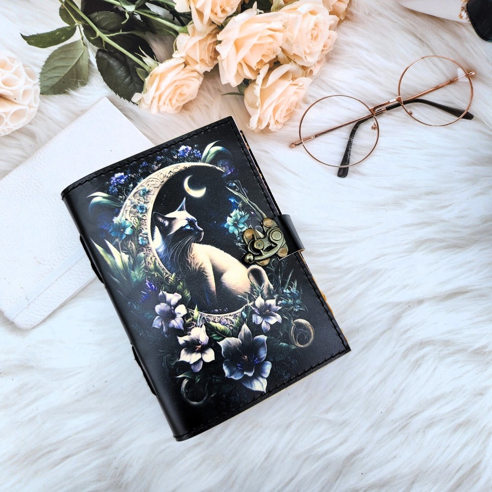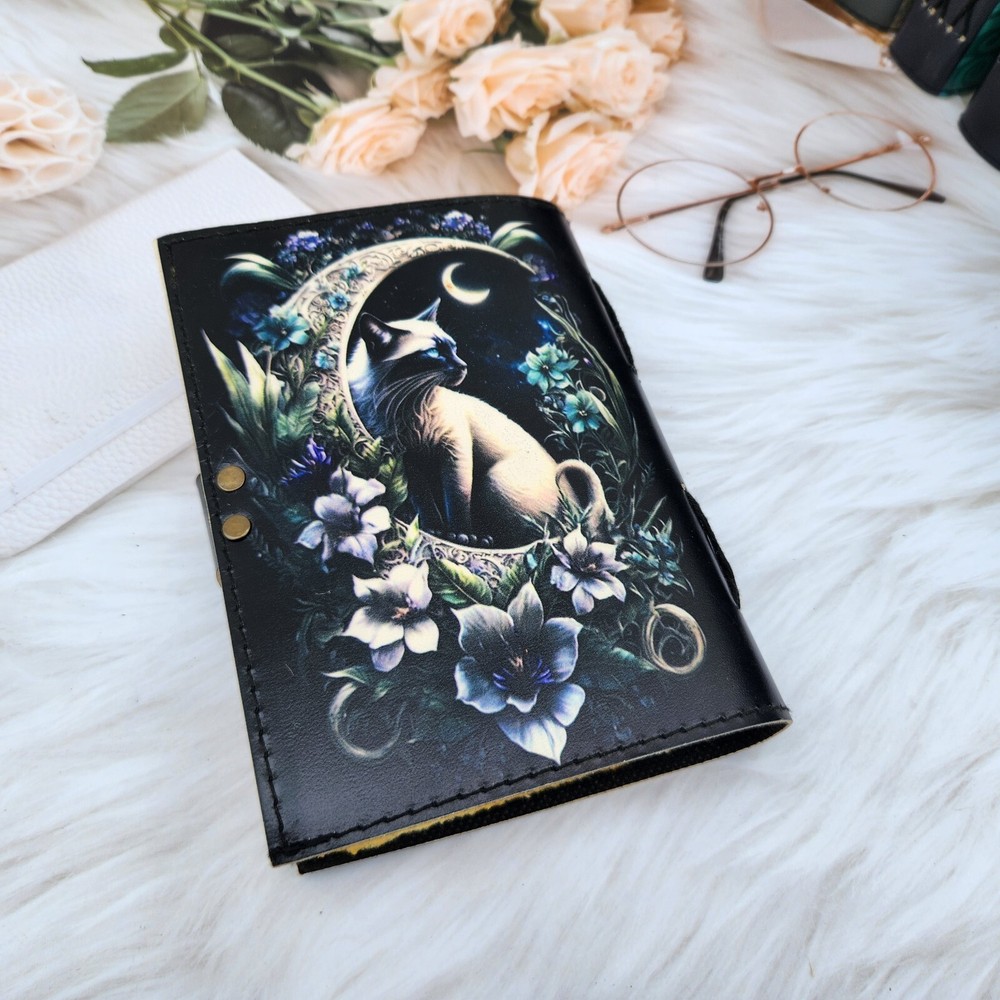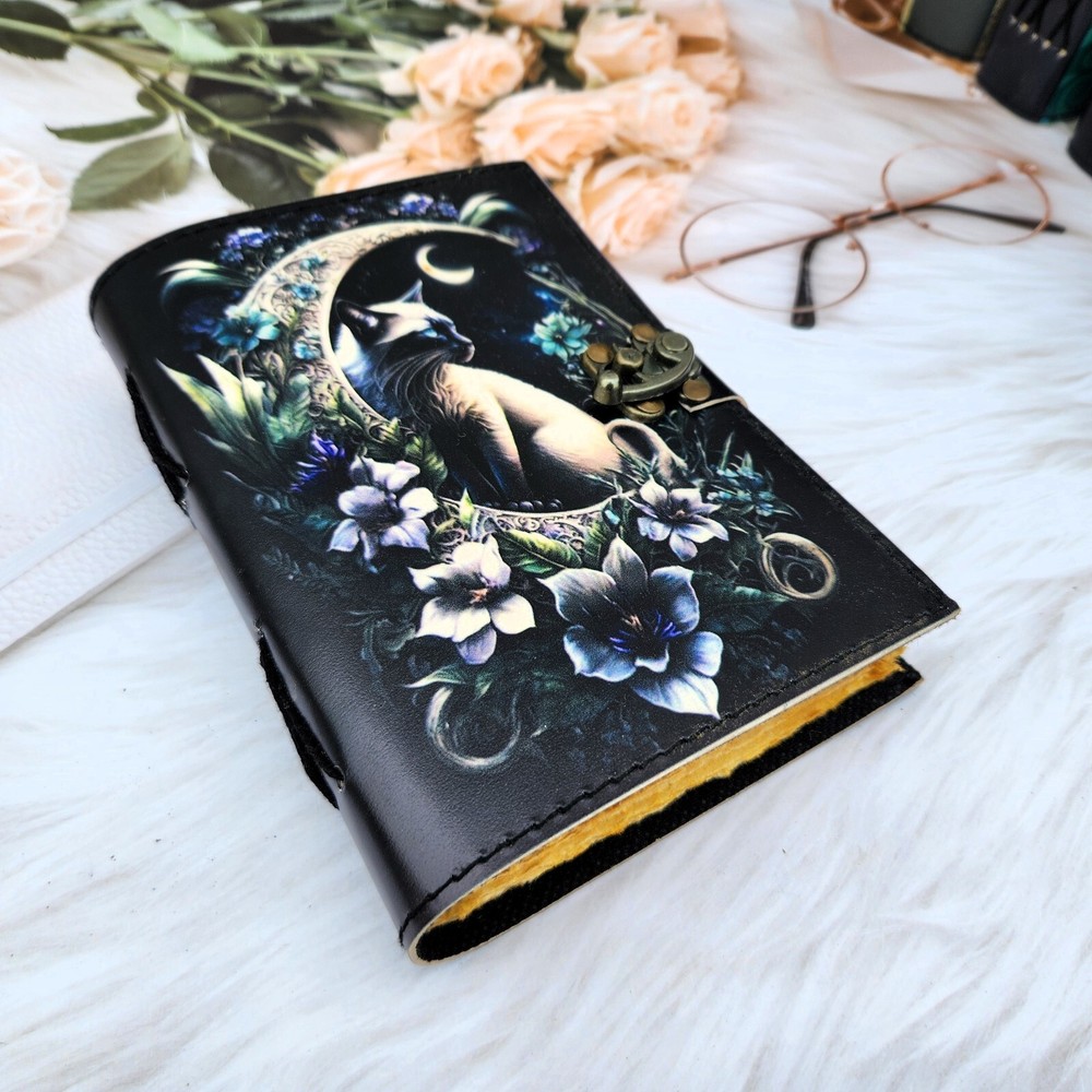 Leather Journal Cat & delicate flower notebook, sketchbook, travel journal, personalized journal, leather dairy, custom journal gift. 1. Introducing our Leather Journal Cat & delicate flower notebook, a perfect blend of elegance and charm. This exquisite notebook features a captivating image of a cat surrounded by beautiful flowers, adding a touch of whimsy to your writing experience. 2. Crafted with utmost care, this notebook is made from high-quality leather, ensuring durability and longevity. Its 200 deckle edge pages provide ample space for your thoughts, sketches, and travel memories. 3. Personalize this journal to make it truly yours or surprise a loved one with a custom journal gift. With its c-lock closure, your precious notes and memories will be securely protected. 4. Whether you're an artist, writer, or simply someone who appreciates the beauty of nature, this Leather Journal Cat & delicate flower notebook is a must-have accessory that combines functionality with style.