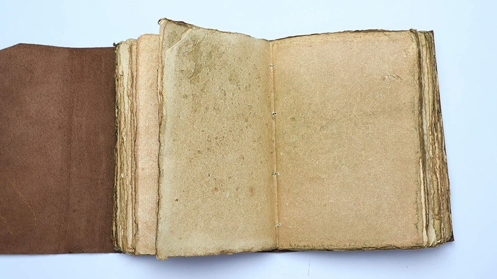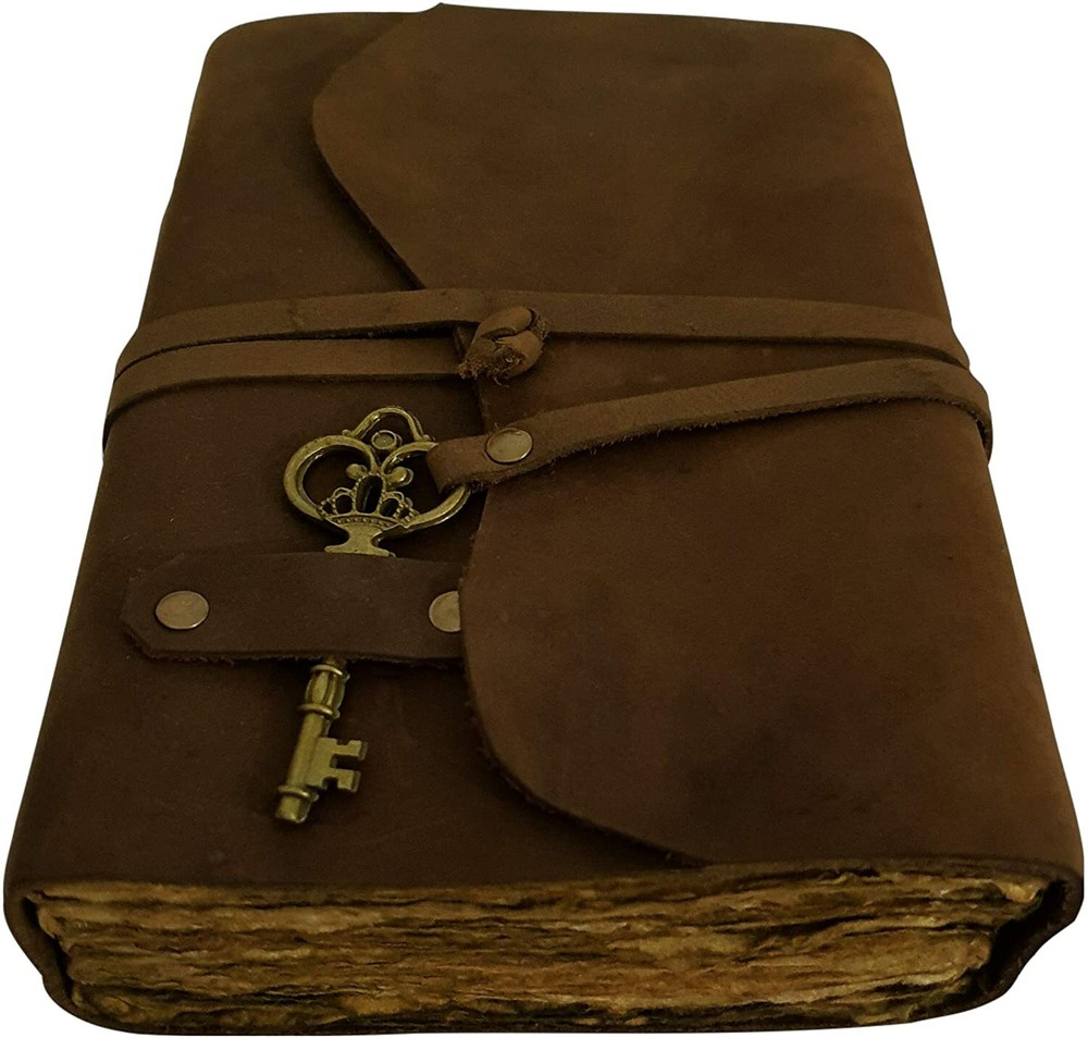 Dimensions: Length - 6 Inches X Height - 8 Inches with Unruled Handmade Paper Binding and Material: Hand-Sewn And Full grain Leather PAGES: 200 Pages Of Deckle Edged Stained Handmade Papers Genuine Premium Water Buffalo Leather Distressed Rustic Leather Bound Hand Made with Recycled Cotton Stained Paper Multiple Pocket Zippered Portfolio Padfloio About Us Aromazotika is a NYC based small business family. All our leather products are handmade with genuine full grain leather. Keepsake Vintage Leather Journal with Vintage Stained Cotton Pages With Brass Key Strap Our Stained Paper Leather Journal has a solid keepsake Journal that is unique and eye catching Dimensions: Length - 8 Inches X Width - 6 Inches with Unruled Handmade Paper Binding and Material: Hand-Sewn Binding. Full grain Leather PAGES: 200 Thick Pages Of Deckle Edged Stained Handmade Papers Genuine Premium Water Buffalo Leather Leather Bound Hand Stitched with Recycled Cotton Stained Paper Brass Key with Strap to wrap this precious Journal\ HANDMADE STITCHED FULL GRAIN VINTAGE STYLE GENUINE LEATHER EXCELLENT CRAFTSMANSHIP SATISFACTION GUARANTEED - 10 Years