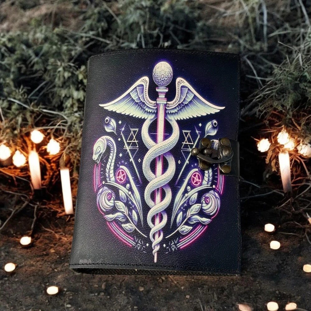This Leather Journal Gothic Notebook Snake Grimoire Print is a luxurious and limited edition handmade journal crafted with a leather cover. Designed for those who appreciate vintage aesthetics with a touch of mystique, this unique notebook is personalized and perfect for those seeking a special writing experience. Made in India, this journal is ideal for adding a touch of sophistication to your writing or journaling routine. The Snake Leather Journal Notebook by KHAFRA HANDMADE Embrace the timeless elegance of The Snake Leather Journal Notebook by KHAFRA HANDMADE, a perfect blend of classic craftsmanship and modern functionality. Handcrafted with meticulous attention to detail, this journal features high-quality leather that not only adds a touch of sophistication but also ensures durability for years to come. Key Features: The Snake Leather Journal Gothic Notebook - Vintage Handmade Book of Shadows with Name, Personalized Gifts for Men, Dark Academia Gift, Handmade Paper: Each page of The Snake Leather Journal Notebook by KHAFRA HANDMADE is made from premium handmade paper, providing a unique texture and a high-quality writing experience. Perfect for writing, sketching, or jotting down your thoughts and ideas. Available in All Sizes: 7x5 inches 8x6 inches 10x7 inches 13x10 inches Whether you need a compact notebook for on-the-go notes or a larger journal for detailed entries and sketches, The Snake Leather Journal Notebook by KHAFRA HANDMADE is available in all sizes to suit your needs. Secure Brass C-Lock: The journal is equipped with a vintage brass C-lock, ensuring that your thoughts, ideas, and sketches remain secure and private. The elegant lock not only adds a layer of protection but also enhances the overall aesthetic of the journal. Ideal for writers, artists, students, or anyone who appreciates fine craftsmanship, The Snake Leather Journal Notebook by KHAFRA HANDMADE is more than just a place to write—it's a companion that inspires creativity and captures memories.