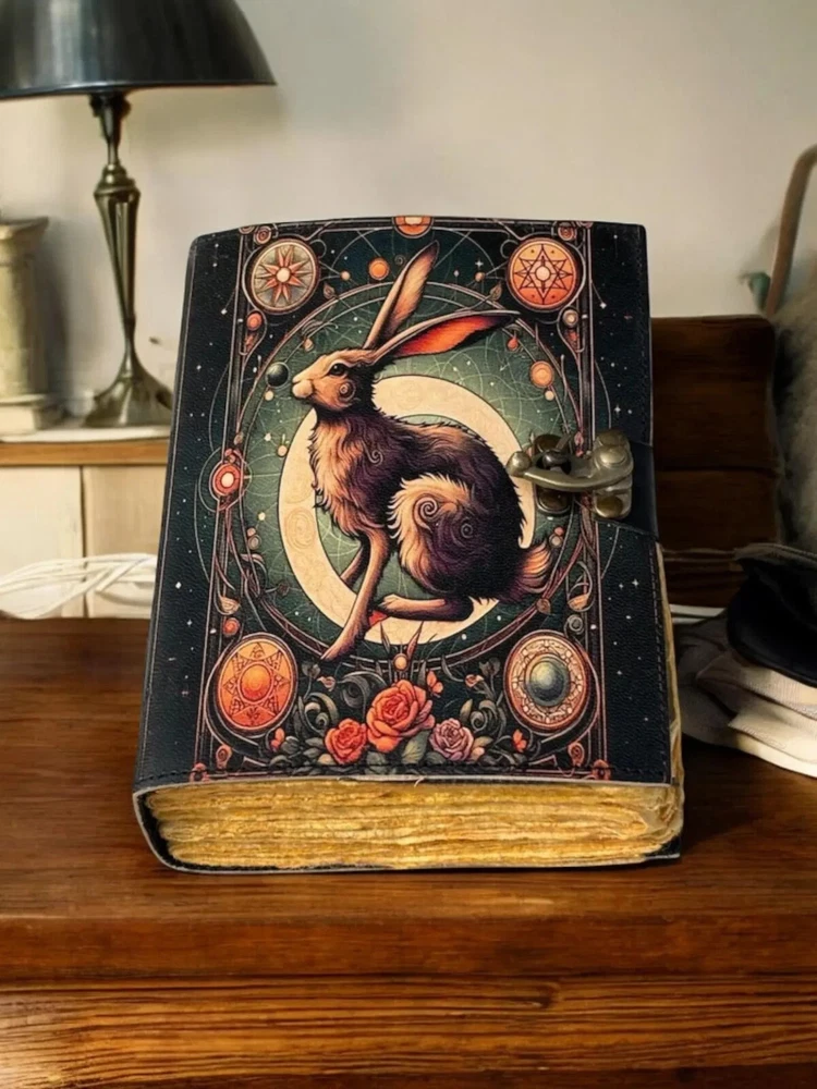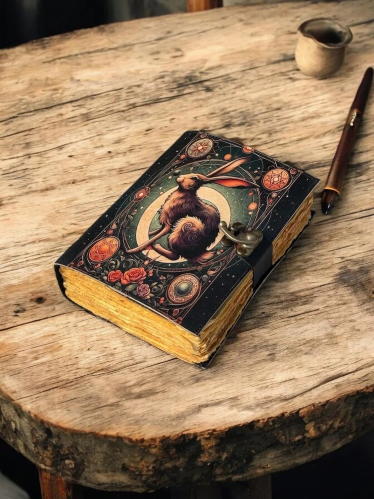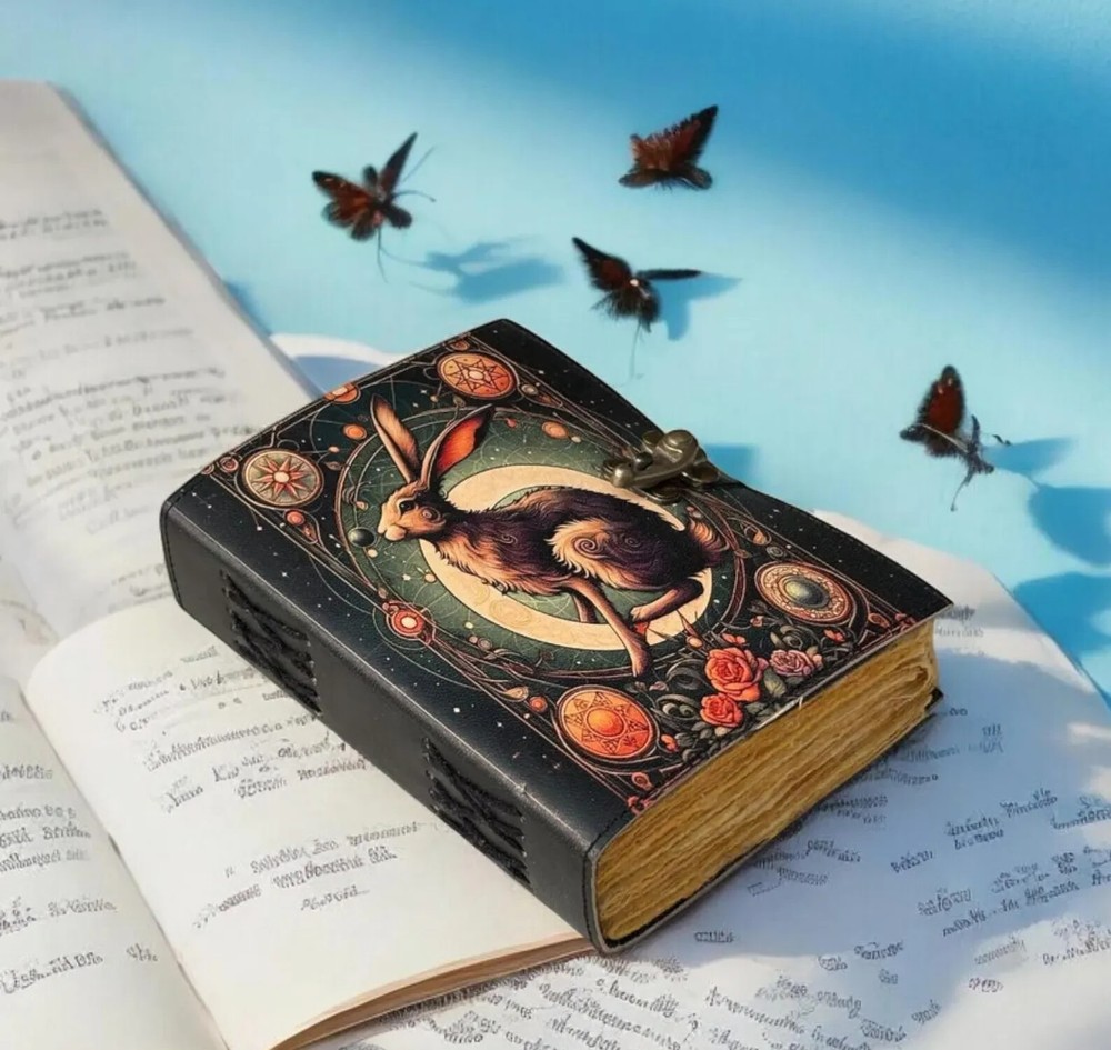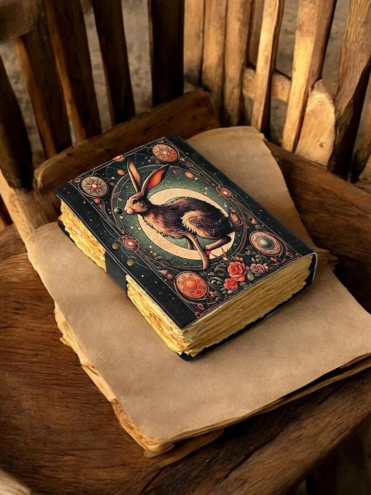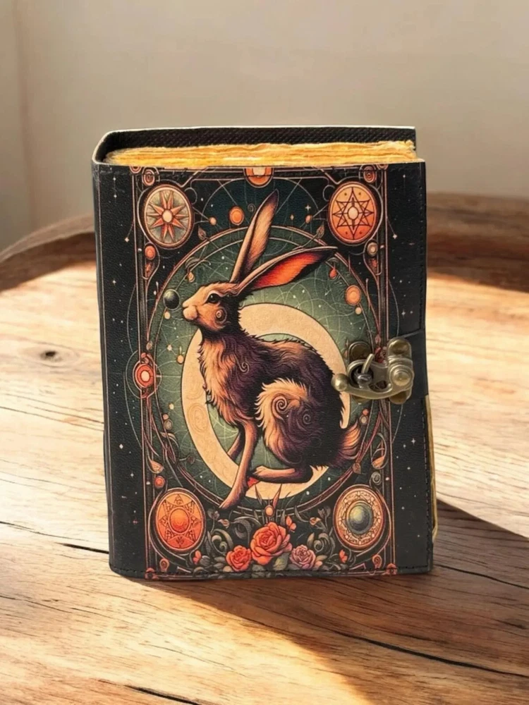 The Leather Journal Gothic Notebook with The Easter Rabbit Grimoire Print is a luxury limited edition diary featuring a leather cover and intricate gothic design. Handmade in India, this notebook is perfect for those looking for a unique and high-quality writing space. The special attributes of this journal make it a standout choice for those seeking a personalized and distinctive writing experience. The Easter Rabbit Leather Journal Notebook by KHAFRA HANDMADE Embrace the timeless elegance of The Easter Rabbit Leather Journal Notebook by KHAFRA HANDMADE, a perfect blend of classic craftsmanship and modern functionality. Handcrafted with meticulous attention to detail, this journal features high-quality leather that not only adds a touch of sophistication but also ensures durability for years to come. Key Features: The Easter Rabbit Leather Journal Gothic Notebook - Vintage Handmade Book of Shadows with Name, Personalized Gifts for Men, Dark Academia Gift, Handmade Paper: Each page of The Easter Rabbit Leather Journal Notebook by KHAFRA HANDMADE is made from premium handmade paper, providing a unique texture and a high-quality writing experience. Perfect for writing, sketching, or jotting down your thoughts and ideas. Available in All Sizes: 7x5 inches 8x6 inches 10x7 inches 13x10 inches Whether you need a compact notebook for on-the-go notes or a larger journal for detailed entries and sketches, The Easter Rabbit Leather Journal Notebook by KHAFRA HANDMADE is available in all sizes to suit your needs. Secure Brass C-Lock: The journal is equipped with a vintage brass C-lock, ensuring that your thoughts, ideas, and sketches remain secure and private. The elegant lock not only adds a layer of protection but also enhances the overall aesthetic of the journal. Ideal for writers, artists, students, or anyone who appreciates fine craftsmanship, The Easter Rabbit Leather Journal Notebook by KHAFRA HANDMADE is more than just a place to write—it's a companion that inspires creativity and captures memories.