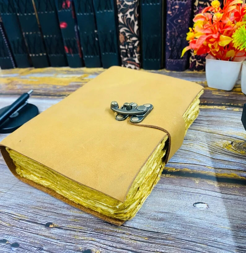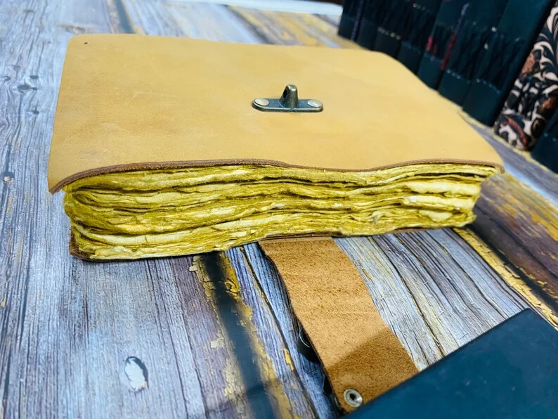 Leather Journal Notebook - 400 Page Handmade Sketchbook & Writing Diary Unleash your creativity and capture your thoughts in timeless style with this handmade leather journal notebook . Whether you're a writer, artist, traveler, or dreamer, this rustic journal is the perfect companion for your everyday inspiration. Features: ๐ 400 Pages of Rustic Charm Filled with 400 pages (200 sheets) of thick, eco-friendly, unlined handmade paper, ideal for writing, sketching, journaling, or scrapbooking. ๐งต Handcrafted Beauty Each journal is carefully hand-stitched, featuring genuine leather with a natural, vintage finish. No two pieces are exactly the same โ making your journal truly one-of-a-kind. โ๏ธ Versatile Use Perfect as a diary, sketchbook, travel journal, poetry notebook, or dream log. Works well with most pens, pencils, charcoal, and light watercolors. ๐ Secure Wrap Closure A classic leather strap wrap keeps your journal safely closed and gives it an authentic old-world feel. ๐ Ideal Size Portable and practical โ great for daily carry, travel, or bedside reflections. (Provide size here, e.g., 7x5 inches or A5, if known.) Why Youโll Love It: This journal isnโt just a notebook โ itโs a space for your imagination to roam free. Whether itโs your next story, sketch, or moment of clarity, it deserves a beautiful place to live.