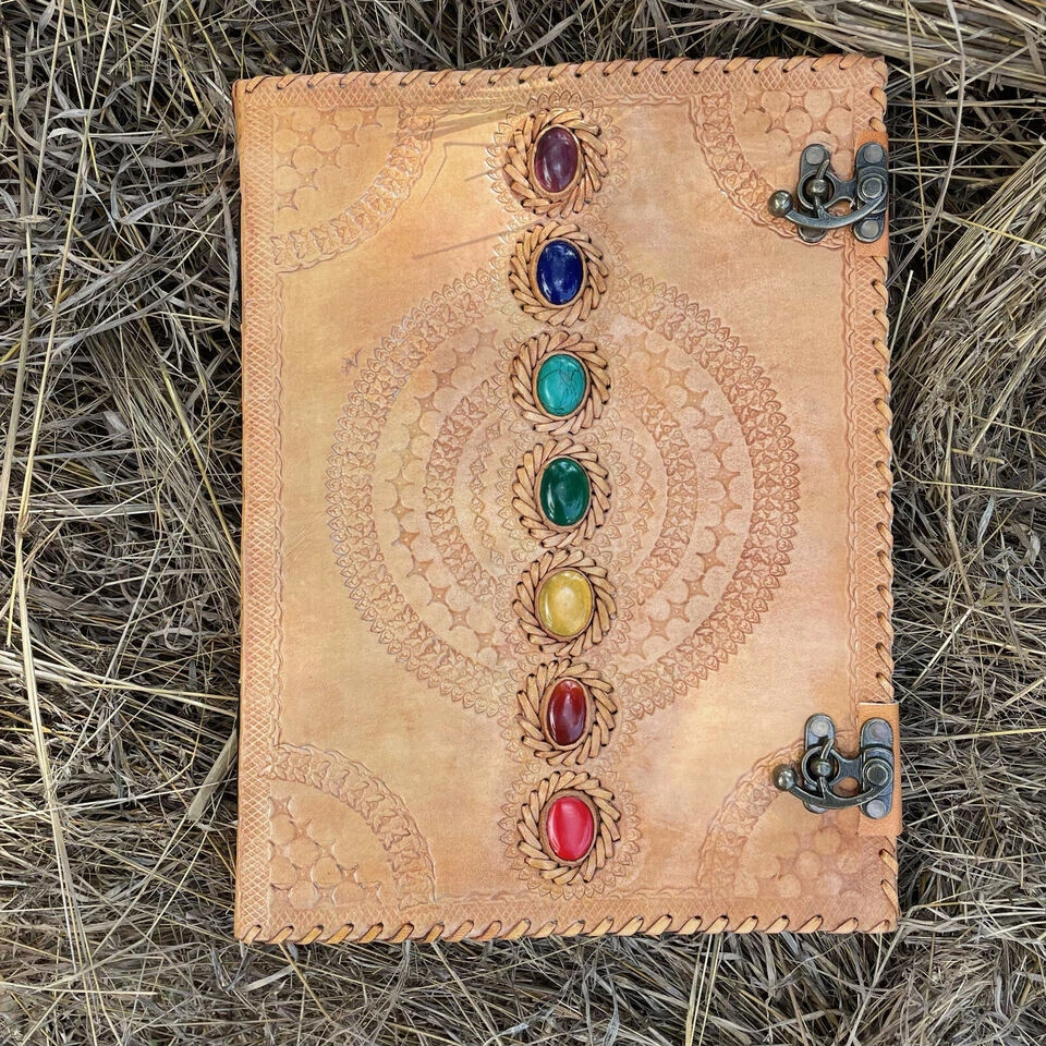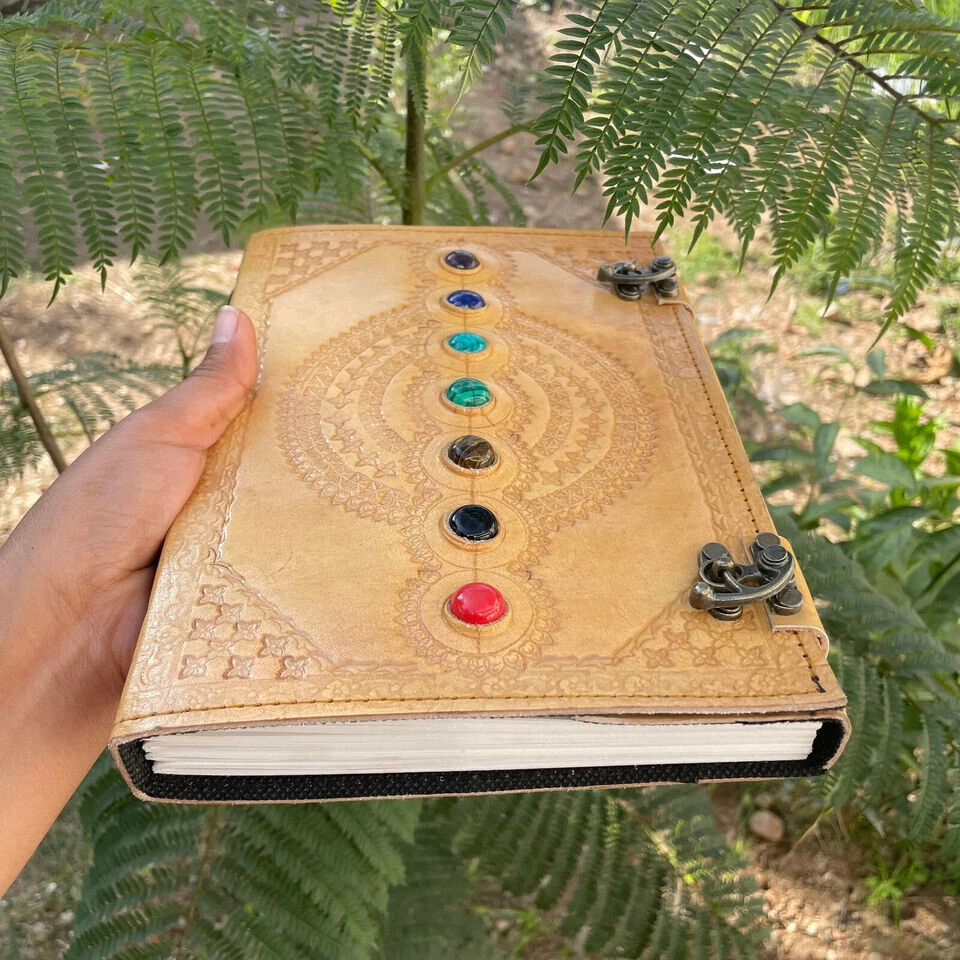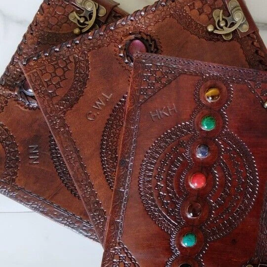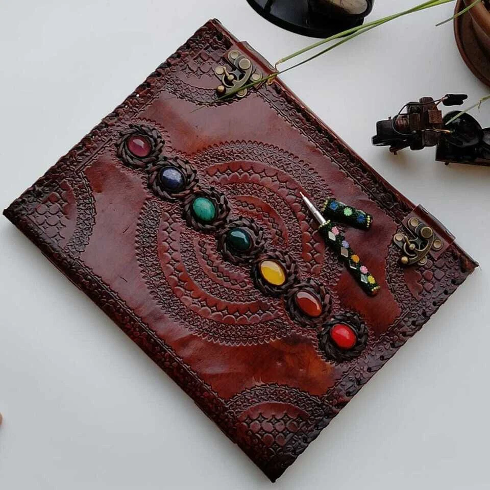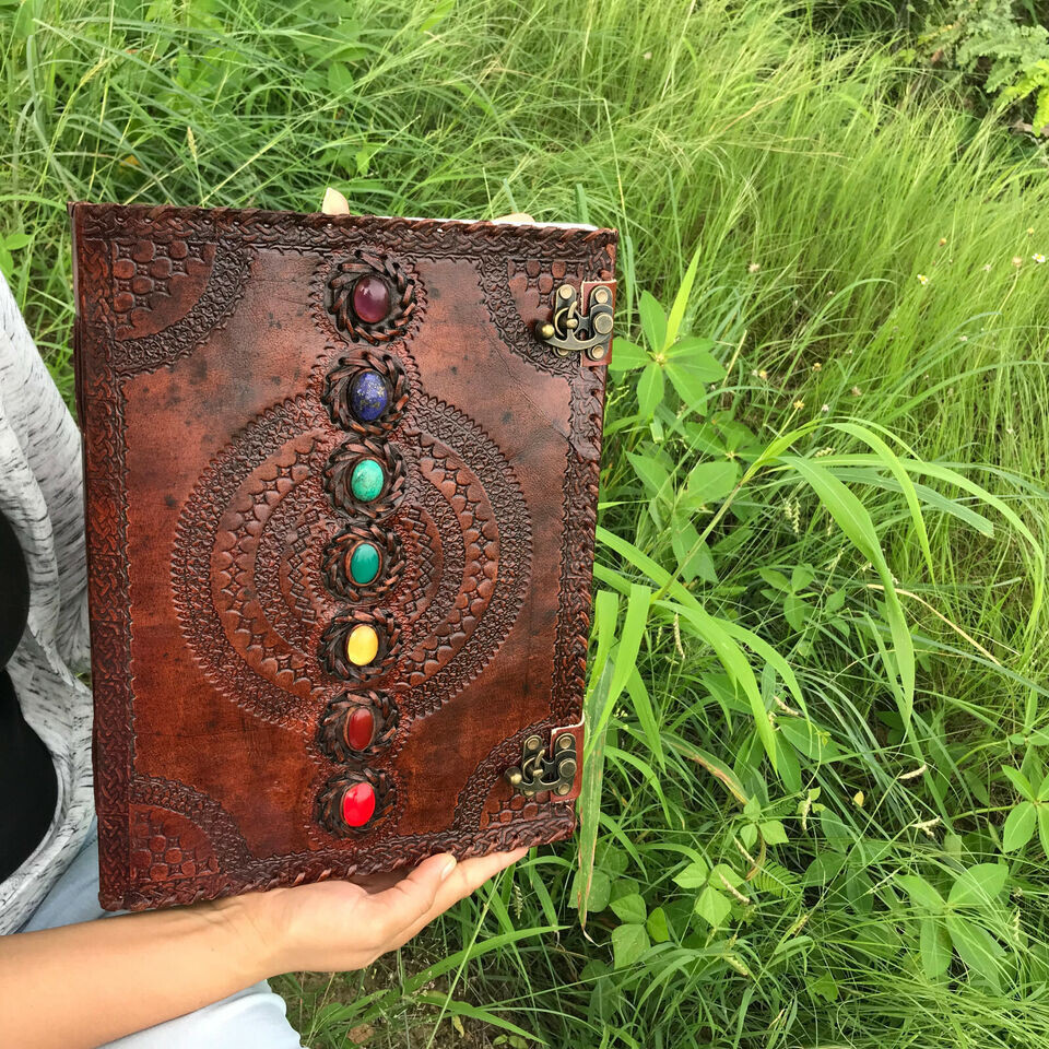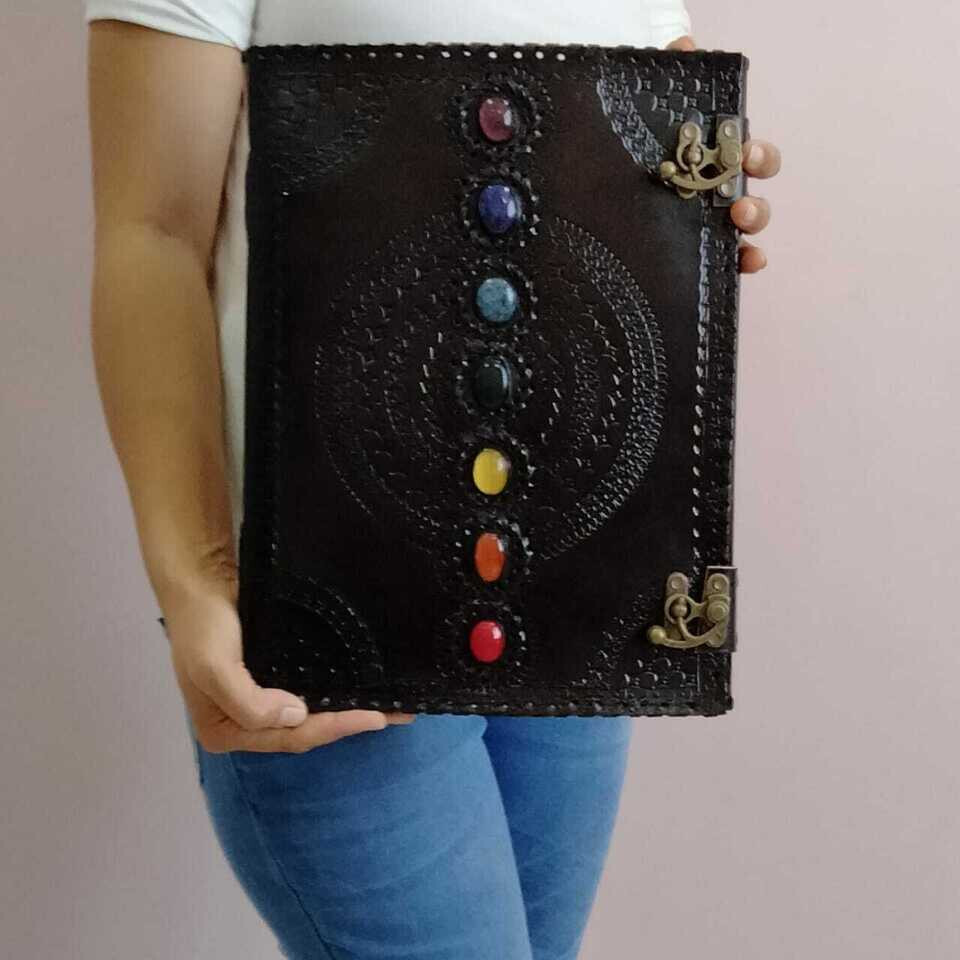 Journal Leather Stone Journal Book Of Spell Book Of Shadows Sevan Stone Handmade Brown Leather Journal, Thanksgiving gift, Christmas Sale. * Gift For Mothers Handmade leather journal with seven different stone ( Semi Precious ) embedded and aligned in the center of the book. * Brown color extra large journal provided with 2 brass lock for enclose at corner edge for enhancing the distressed look of journal. * Beautiful journal gift on Father's day, Mother's day, Anniversary,graduation etc. * Completely Hand process,genuine leather,vintage embossed with 2 brass buckle c Lock closure. * Size : Medium - 10 Inch Height x 7 Inch wide , Large - 13 Inch Height & 10 Inch wide * Color : Brown & Black * Beautiful brass c clock closure * 100 Sheets/200 Handmade Pages * Personalisation: Enter your name,initials for engrave on the bag. Max 5-6 letters Example : DAD, MAMA, KATIE, ADL Contact for any issue before leave review. Thanks for purchase. Visit again and for more products click link as below. Thanks again.